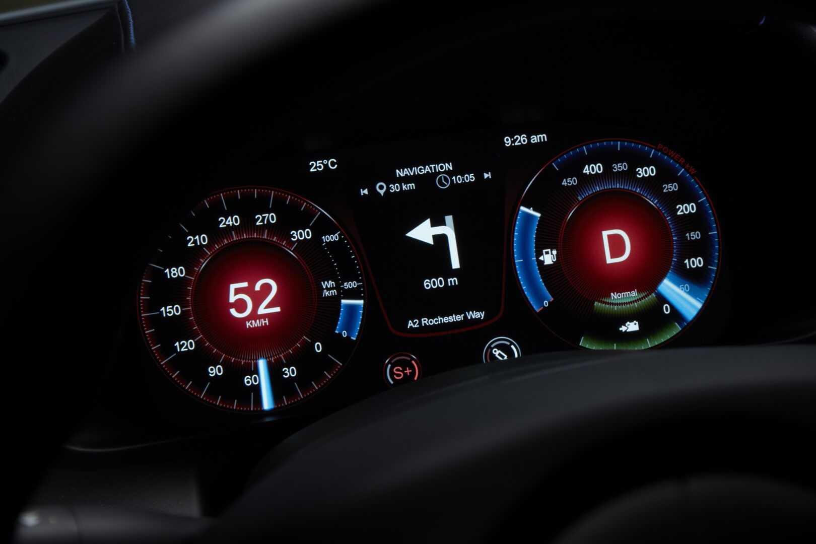 В электромобиле нет места классическим аналоговым приборам от Aston Martin, вместо них теперь 10-дюймовый цифровой дисплей предоставляющий водителю всю необходимую информацию, включая состояние заряда, мощность двигателя, скорость, рекуперативные характеристики, потребление энергии.