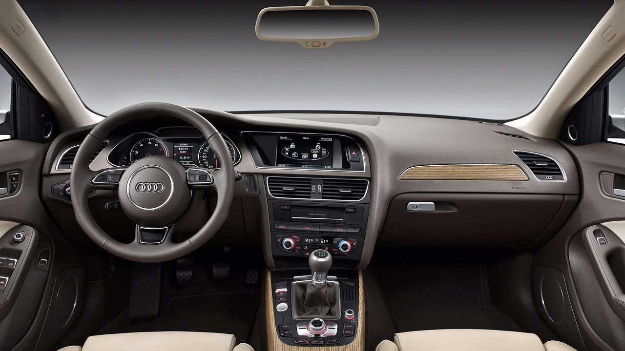 Интерьер автомобиля изменен полностью, теперь он выглядит намного шикарнее и современнее. Водителю достанется 3-х спицевый руль с органами управления мультимедией, обшитый кожей. За рулем расположена большая и красивая приборная панель Audi A4 B8, имеющая два огромных аналоговых датчика спидометра и тахометра, а также немаленький информативный бортовой компьютер.