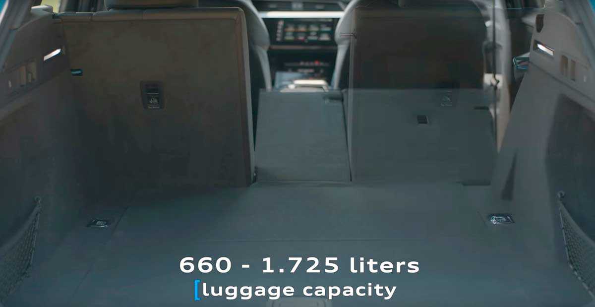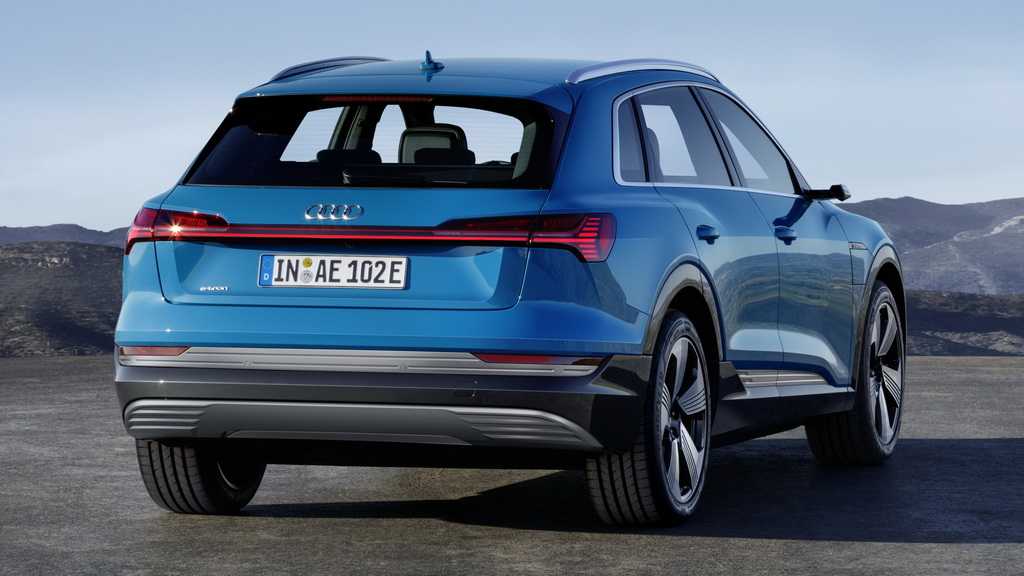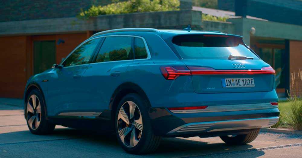 Сзади приятно смотрится купеообразная крыша кроссовера. Применили сплошные светодиодные фонари, архитектура которых – разделенные линии. В таком же стиле созданы нижние хромированные накладки и даже в местах выхлопных труб серебристых пластик e-tron разрезан на линии.