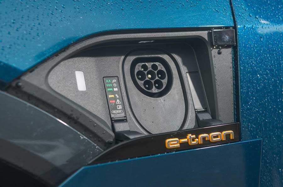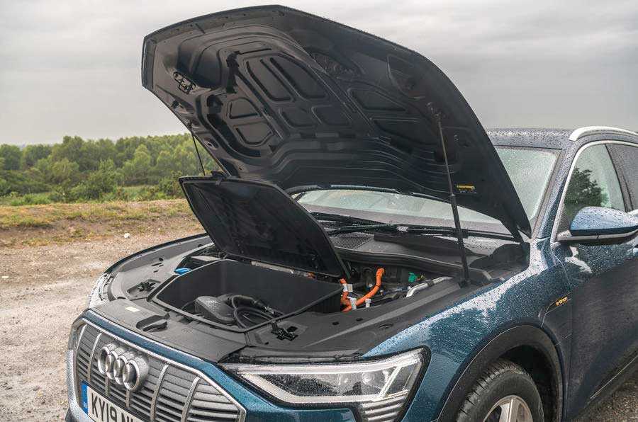 Зарядка е-трона лежит в переднем багажнике. От специальной станции до 80% аккумуляторы заряжаются за пол часа. Заряжая от классической розетки потребуется 8,5 часов для полной зарядки.