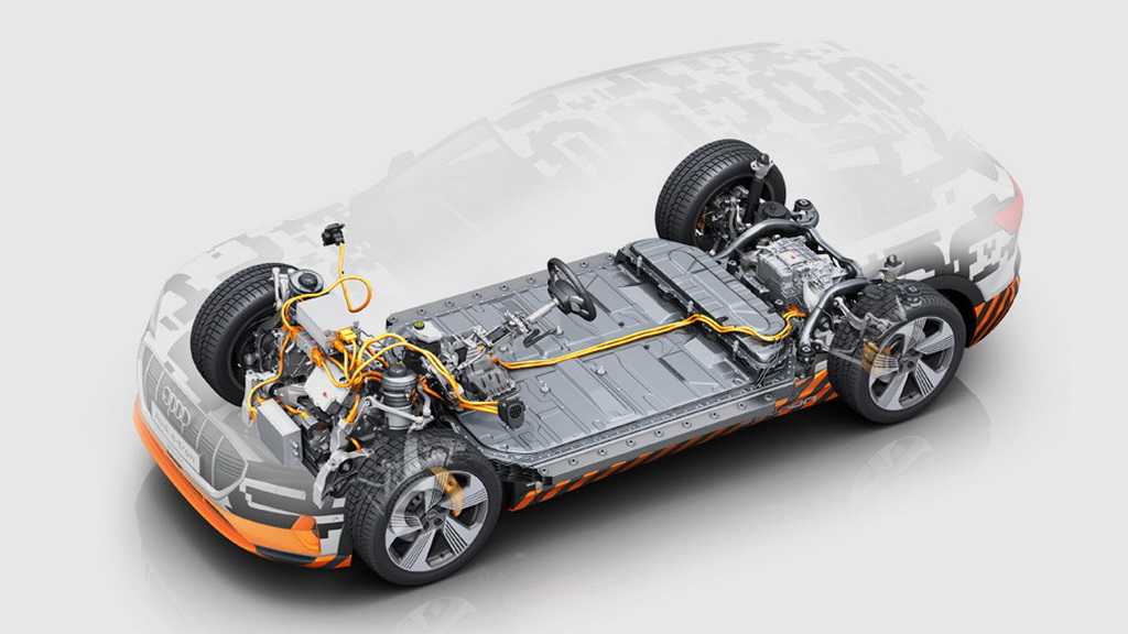 В основе нового Audi e-tron лежит платформа MLB evo, на которой базируются другие крупные кроссоверы с четырьмя кольцами, например, Audi Q7 и Audi Q8. Однако конструкция «тележки» была адаптирована под установку большого количества электрооборудования, в том числе, мощной и увесистой аккумуляторной батареи. По внешним габаритам «и-трон» располагается между моделями Q5 и Q7, имея длину 4901 мм, ширину 1935 мм и высоту 1616 мм. Колесная база новинки составляет 2928 мм, а дорожный просвет заявлен на уровне 172 мм.