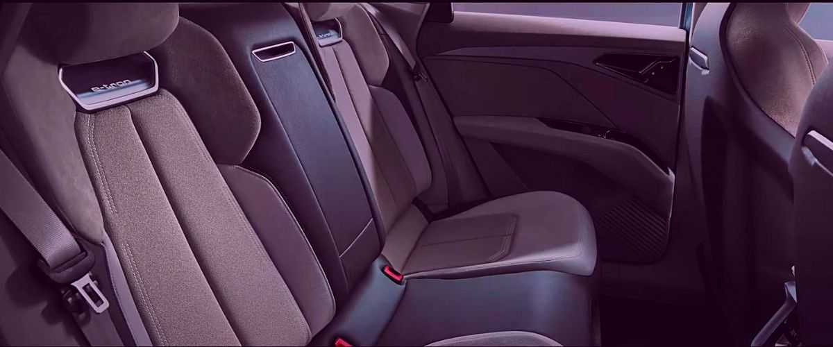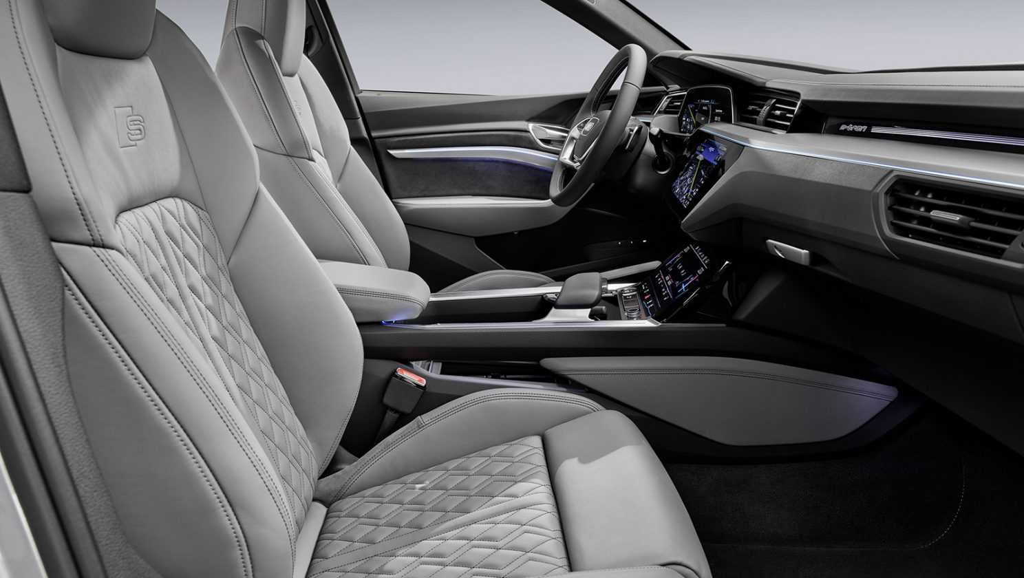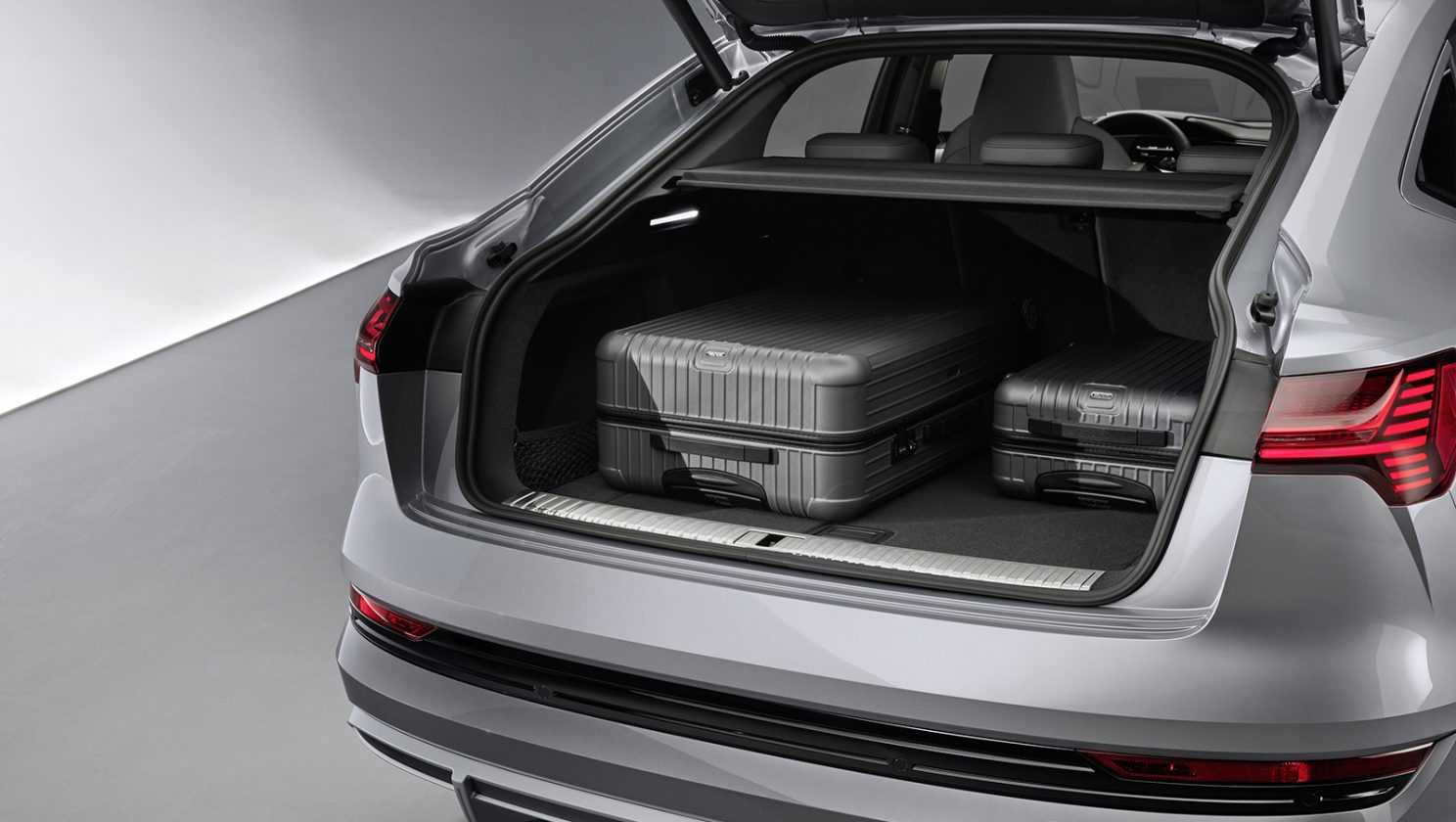Пятиместный салон с тремя экранами на передней панели в целом такой же, как у базового е-трона, но потолок над задним рядом стал ниже на 20 мм. Объем багажника «под полкой» сокращен с 600 до 555 литров, а со сложенными задними сиденьями — с 1665 до 1595 литров. Сохранен оборудованный под капотом 60-литровый отсек, где можно хранить переносное зарядное устройство.