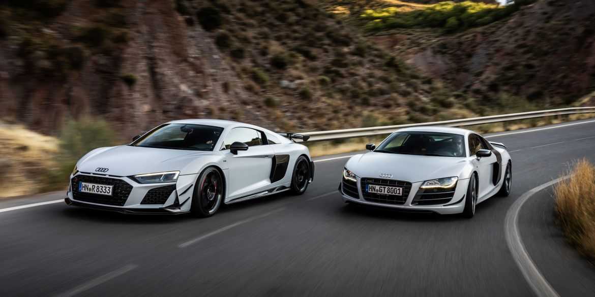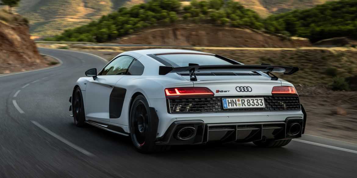 Audi R8 с приставкой GT увидела свет в мае 2010 года. Машина задумывалась как более легкая и мощная версия стандартной «двухдверки» с мотором V10: снаряженная масса снизилась до 1525 кг, а мощность выросла до 552 л. с. Внешне такие R8 можно было отличить по аэродинамическому «оперению» из карбона и двум круглым патрубкам выхлопной системы.