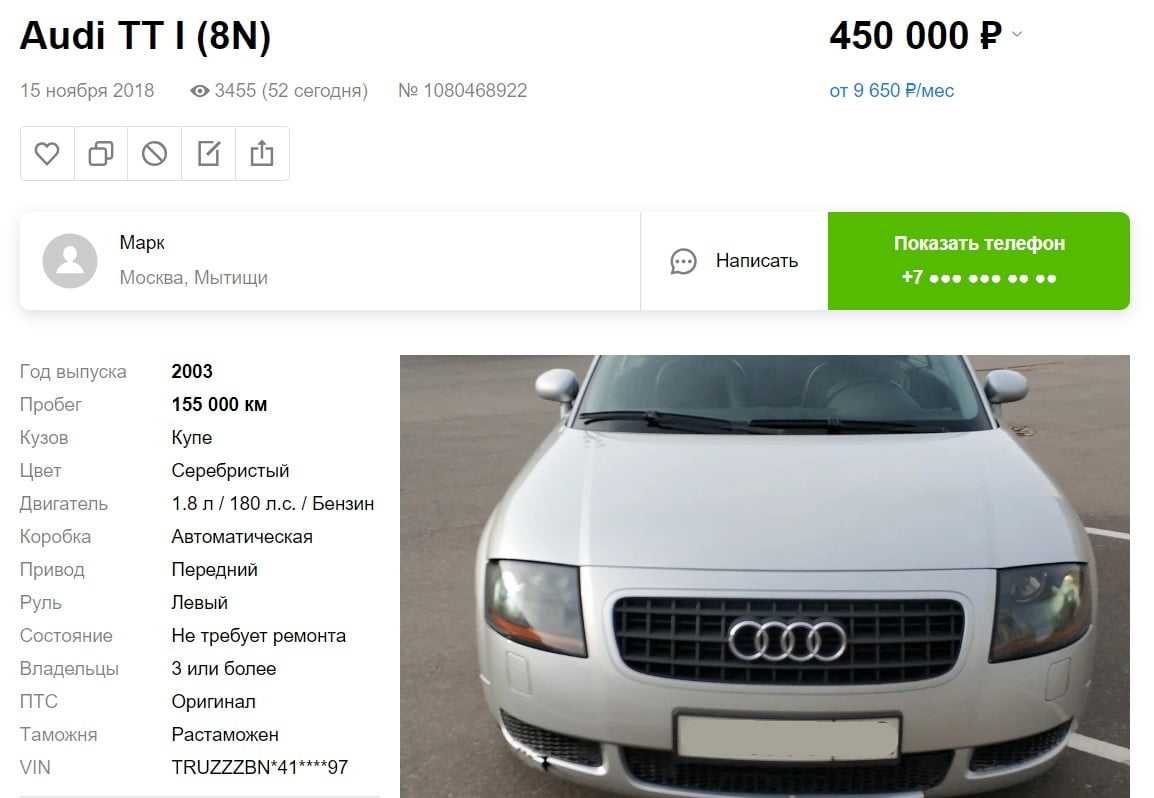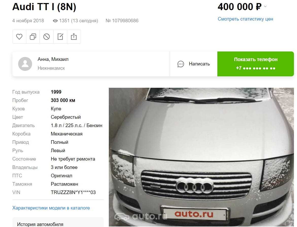 1) Сначала рассмотрим вариант Audi TT (8N) в кузове купе, который продавался в России с 1999 по 2003 гг. Автомобиль имел турбированный мотор на бензине AUQ (1.8 л., 180 л. с.), работающий с 5-ст МКПП и передним приводом.
