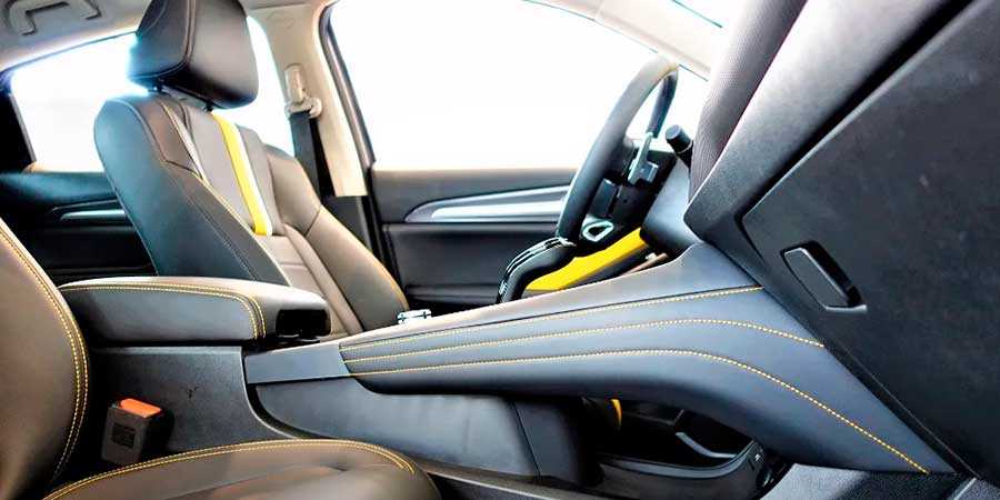 - боковины центральной консоли, передний подлокотник, панель приборов и карты дверей обшиты материалом, похожим на экокожу, на котором просматриваются прострочки, на торпедо присутствует серебристая вставка с «чешуйчатым» рисунком;