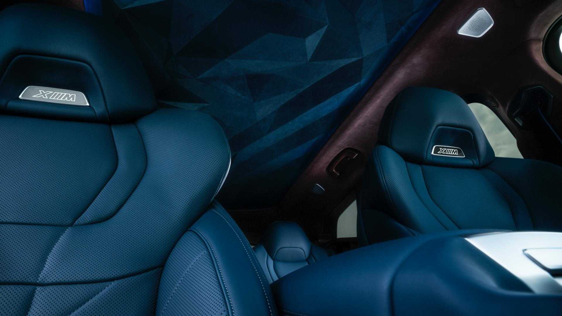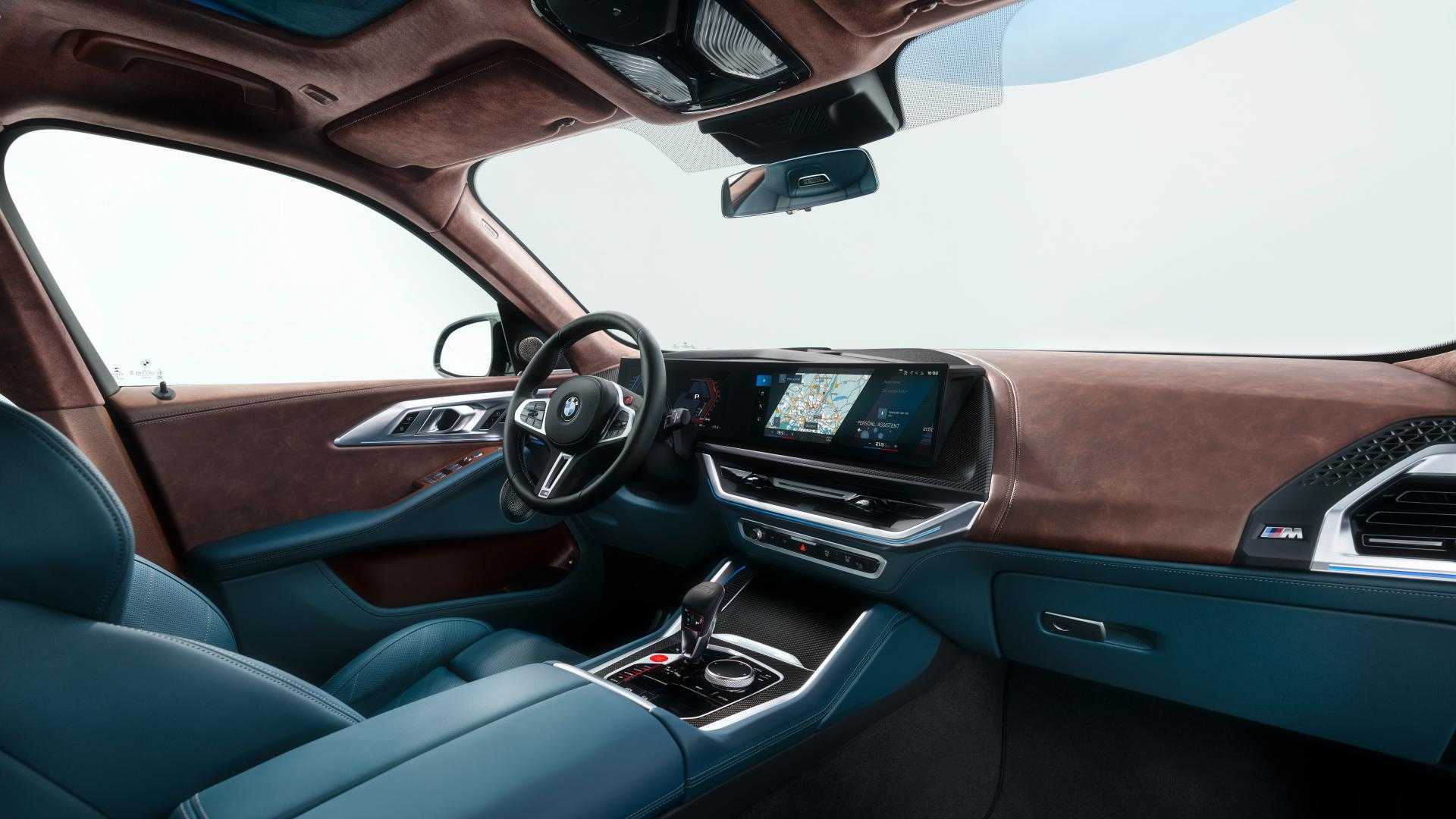 Салон кроссовера отделан коричневой кожей (в BMW называют ее вид «винтажным»), а декоративные накладки выполнены из углепластика. XM также получил изогнутый экран, как у iX, а между ним и селектором «коробки» расположились три одинаковых шестиугольника: два из них выполняют функцию вентиляционных отверстий, а в третий встроен сенсорный дисплей климатической системы.