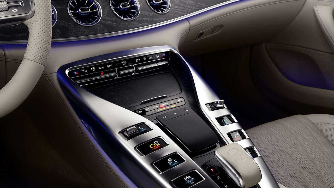 Под центральным дисплеем Mercedes-AMG GT 4 door карбоновая вставка с тремя красивыми дефлекторами воздуха. Под этой вставкой фирменная контурная подвеска, распространенная по всему салону. Цвет подсветки можно выбрать через центральный дисплей.