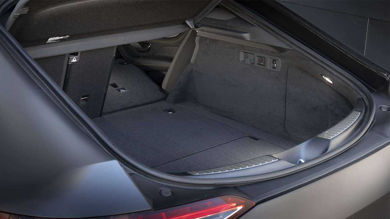 Багажник Мерседес АМГ ГТ 63 обладает такими характеристиками как объём 398 л, как у малолитражного хетчбэка, дверь лифтбэк. Задние сиденья можно сложить кнопками из багажника увеличивая пространство для перевозки грузов до 1300 л (хотя вряд ли это спортивное авто приобретается для этих целей). Под фальшь полом естественно нет ни докатки ни ремкомплекта. На специальных шинах после прокола можно проехать до 120 км.