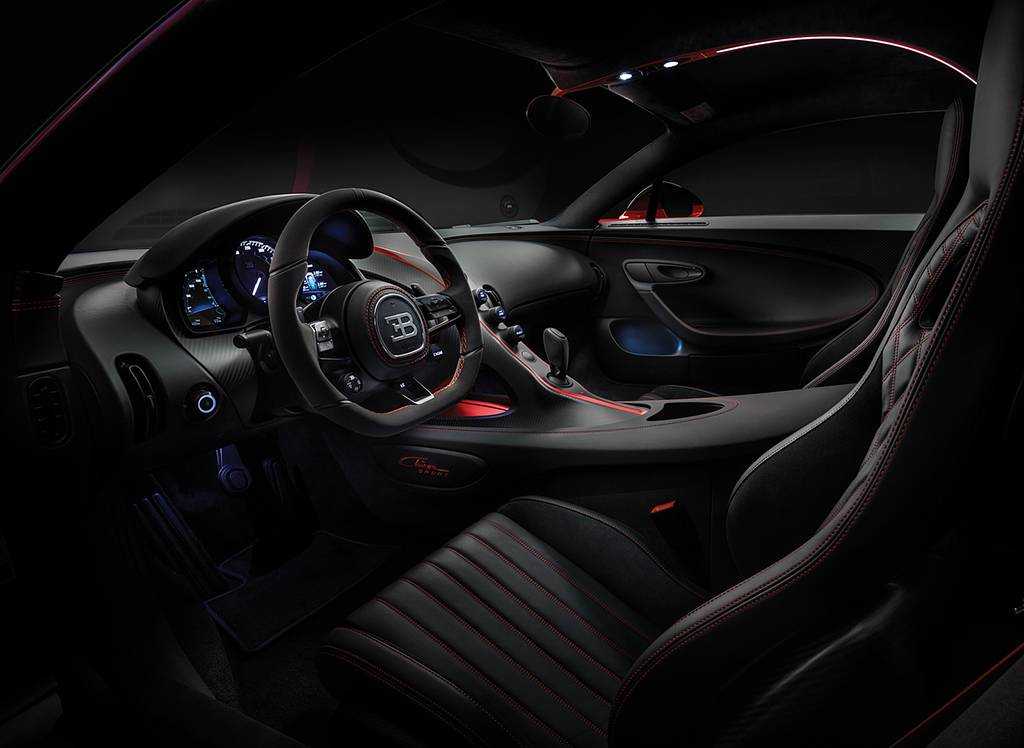 Что касается интерьера нового Бугатти Широн Спорт, то в его салоне появились особые логотипы, а кнопки запуска мотора и переключения режимов движения получили черное анодированное покрытие. Плюс для авто подготовили несколько эксклюзивных пакетов отделки. К примеру, на снимках салон машины отделан черной кожей и замшей с красными акцентами и вставками из углеволокна.