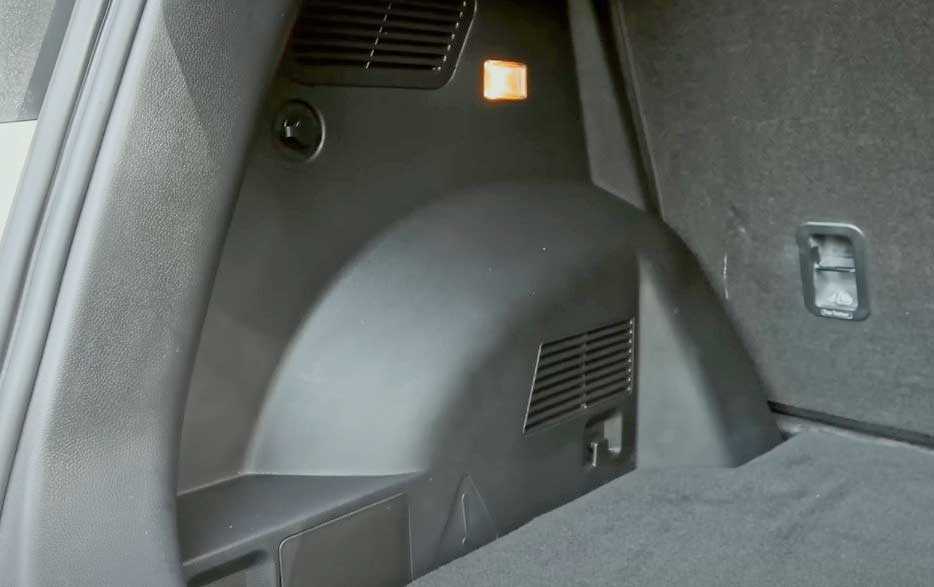 Боковые обшивки в багажнике выполнены из жесткого темного пластика, на левой стороне располагается прямоугольный фонарик подсветки с галогенной лампочкой, также по бокам есть крючки.