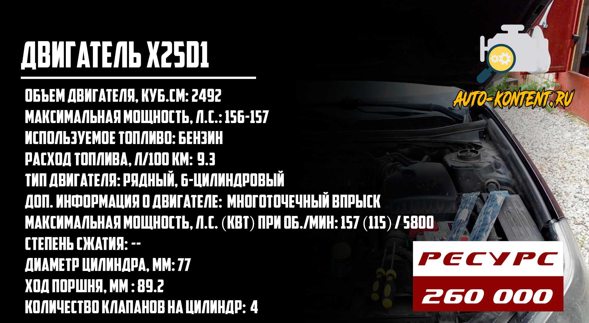 Под маркировкой X25D1 скрывается 2.5-литровый силовой агрегат, оснащенный распределенным впрыском топлива, выдающий в пике 155 лошадиных сил и 237 Нм крутящего момента. В приводе данного мотора находится цепь, фазорегулятор и турбонаддув отсутствует, но есть гидравлические компенсаторы. Особенность двигателя, как и в случае с X20D1, кроется в системе Variable Intake System. Конструктивно это точно такой же 6-цилиндровый рядный силовой агрегат с алюминиевым блоком, который накрывает 24-клапанная также изготовленная из алюминия головка блока цилиндров.