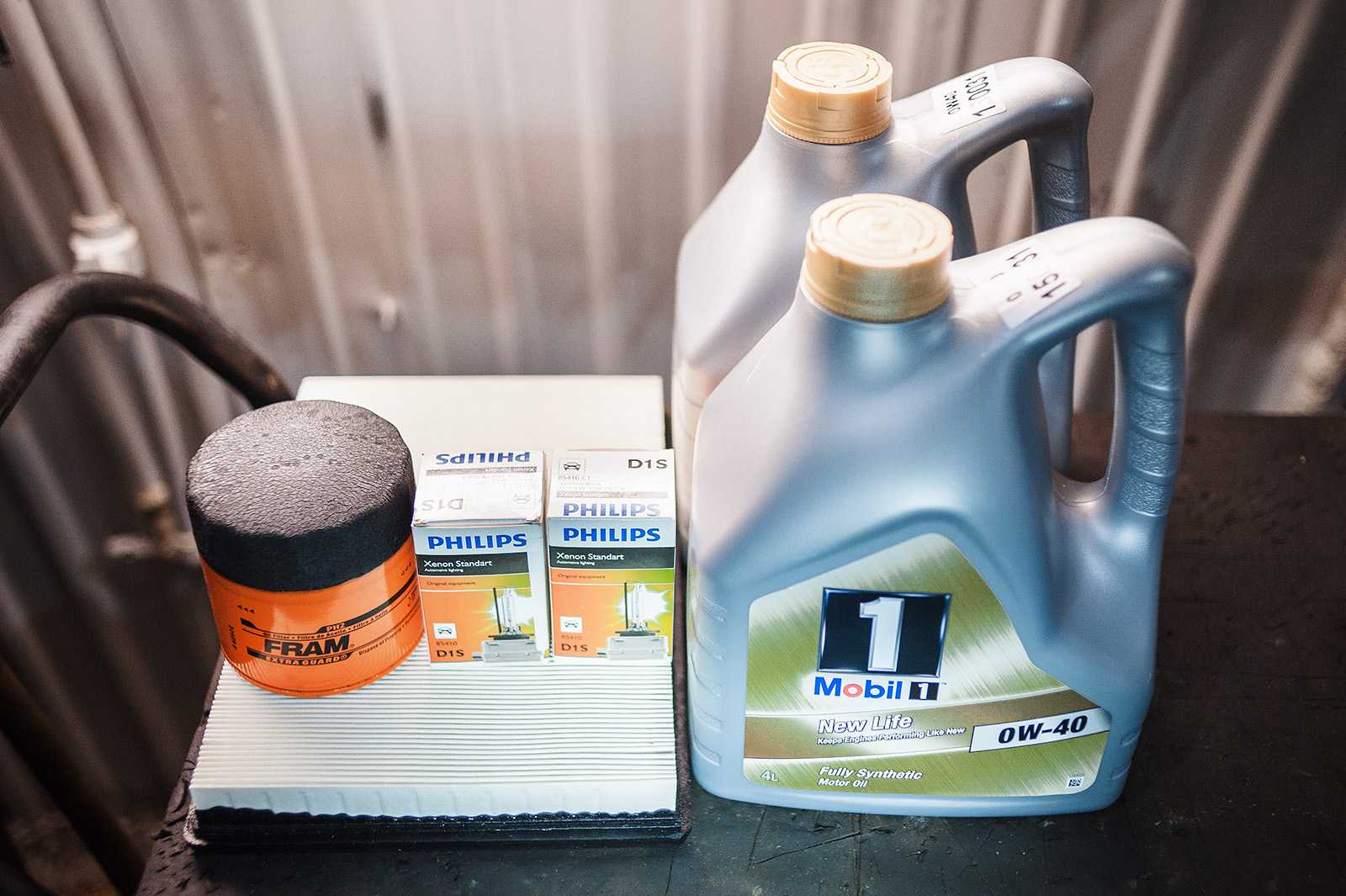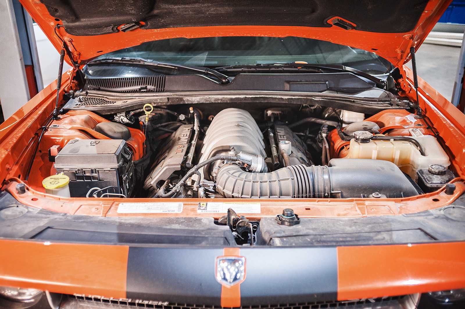 Поднимаем Dodge Challenger SRT8 на подъёмнике и даём маслу стечь. Для для оборотистого и объёмного двигателя HEMI 6.1 его требуется меньше семи литров, для замены используем рекомендованное масло Mobil 1 0W-40, на котором машина приехала из США.