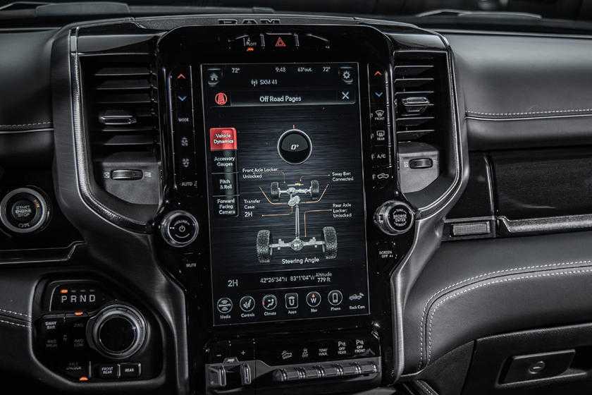 Фронтальная часть машины получила обновлённую светодиодную головную оптику, новую фальшрадиаторную решётку, в центральной части которой появилось наименование модели (Ram), а также агрессивный передний бампер со строгими прорезями противотуманок и вмонтированной лебёдкой, способной осилить 5450 кг. На месте остался массивный капот, а вот от хрома в компании решили отказаться, на смену которому пришёл более практичный матовый пластик чёрного цвета.