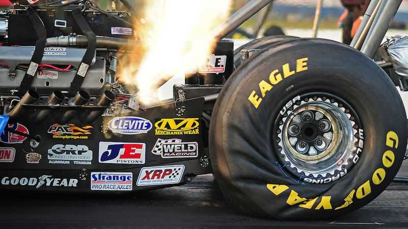 По правилам, топливо может содержать до 90% нитрометана (CH3NO2), а остальные 10% – метанол. В зависимости от влажности воздуха и атмосферного давления пропорции меняют – это целая наука. В двигатель топливо подается насосом, способным накачать 300 литров в минуту. Во время прогрева, отжига и самой четырехсекундной гонки драгстер съедает 60 л топлива.