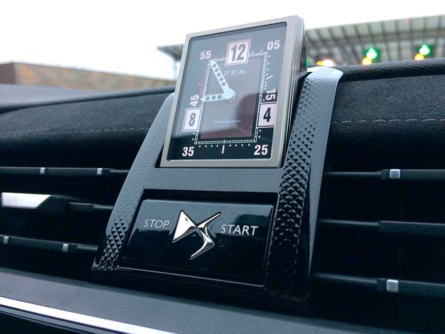 В центре приборной панели находится кнопка запуска двигателя, при нажатии на которую появляется циферблат вращающихся часов известной фирмы BRM R180.