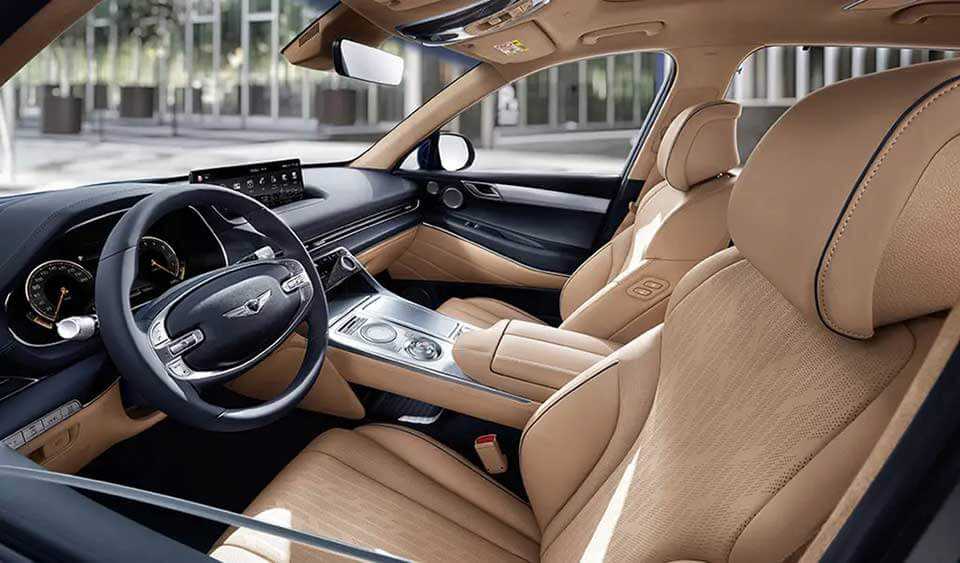 Салон у Genesis GV80 выдержан в премиальной стилистике: в интерьере кожа сочетается со вставками из натурального дерева и металла. Широкий трансмиссионный тоннель у корейской модели установлен под большим углом, что существенно повышает удобство управление системами, которые отвечают за настройку шасси и других устройств. Кроссовер лишен привычного рычага КПП. Его место занимает крупная шайба. Посадка в Genesis GV80 удобна на всех трех рядах сидений во многом благодаря длинной колесной базе.