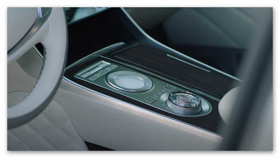 Мы уже упоминали поворотный селектор передач. Сверху находится круглый мультимедийный контроллер с вогнутой формой и металлической рифленой поверхностью. Его внешнее кольцо имеет возможность двойного управления, как четырехстороннего, так и вращательного. Центральная панель внутри контроллера представляет собой одновременно нажимаемую кнопку и панель для распознавания символов. Панель управления HVAC в верхней части центральной консоли имеет емкостные сенсорные кнопки, которые обеспечивают как звуковую, так и тактильную обратную связь, с функцией быстрого доступа, которая позволяет смахивать, чтобы влиять на скорость вращения вентилятора. Панель использует «интеллектуальную маскировку» для блокировки кнопок, которые не задействованы в текущей функции, что предотвращает случайное неправильное использование.