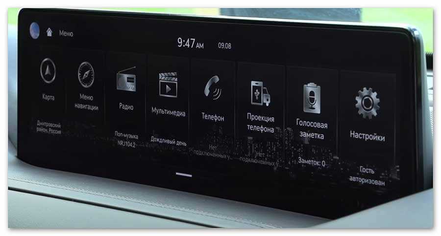 Экран мультимедиа здесь возвышается по центру, является отдельно стоящим устройством, изолированным от приборного щитка и климатической установки.