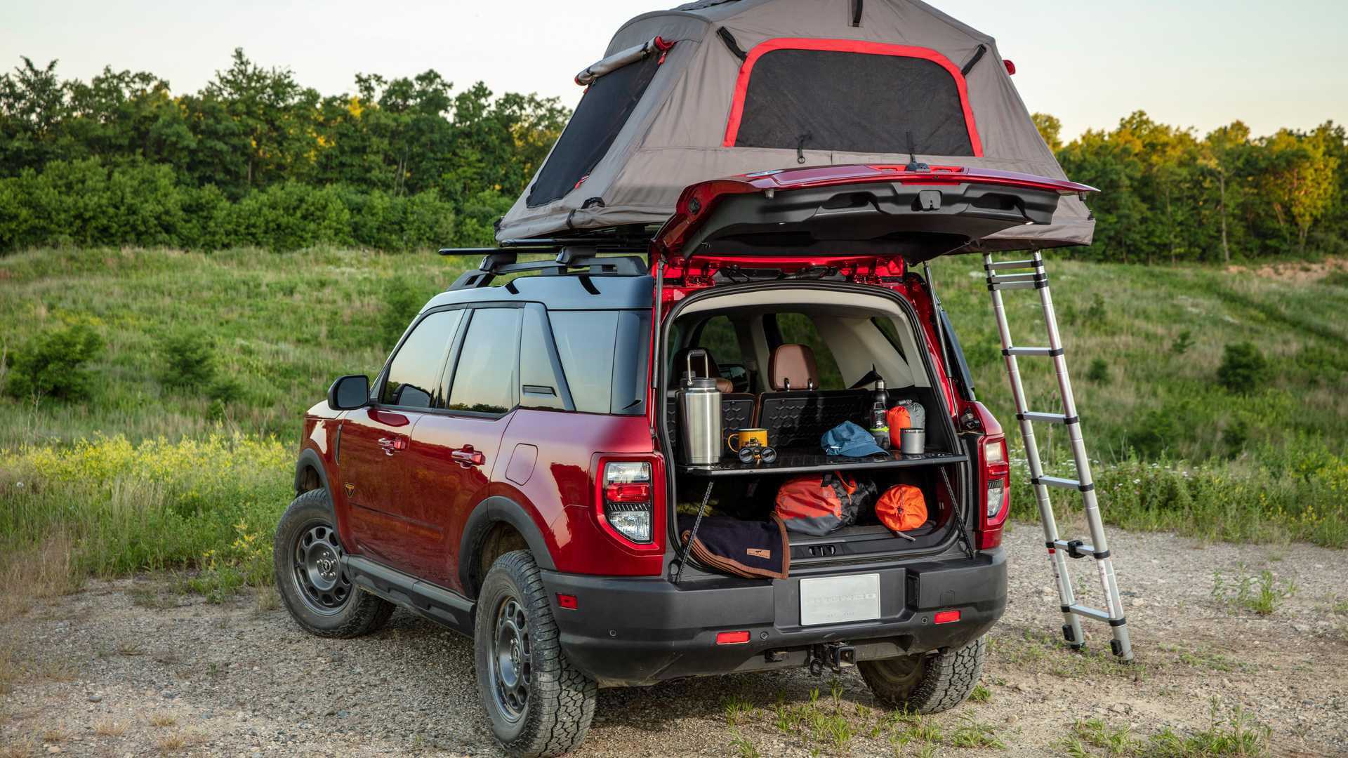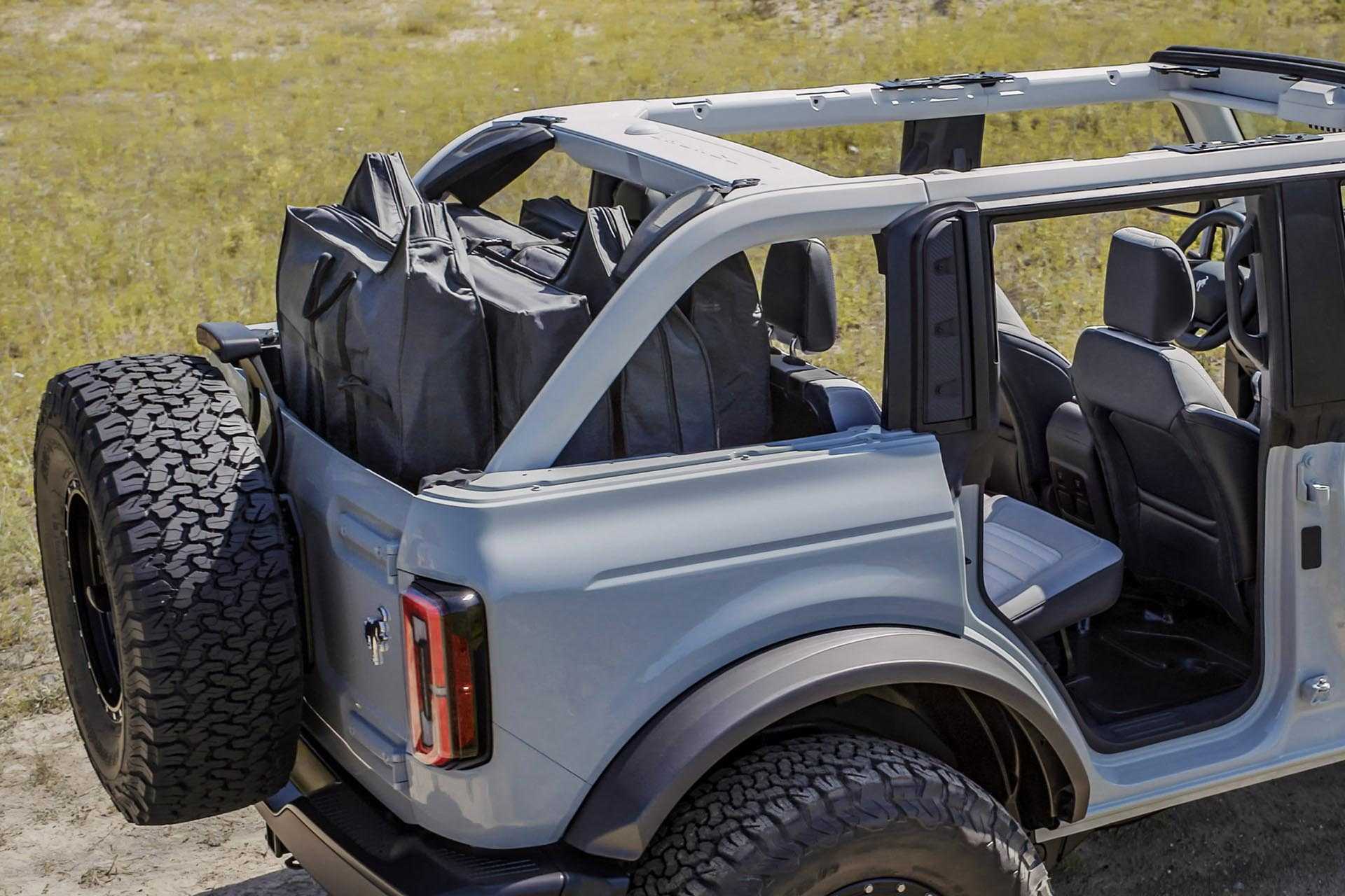 С оглядкой на прошлые поколения Bronco и главного конкурента в лице Jeep Wrangler у модели можно снять примерно все части кузова. Двери, кстати, помещаются в багажник! Круто же! Кстати, жёсткая крыша у трёхдверного Bronco, а у пятидверки в базе матерчатая.