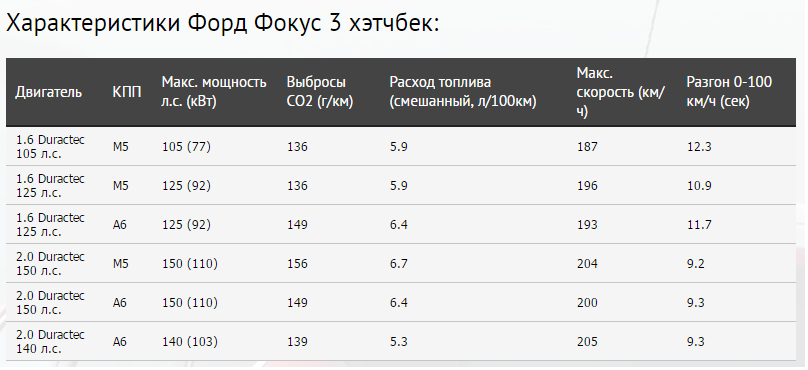 Автомобиль Ford Focus 3 в версии хэтчбек обладает следующими техническими характеристиками, представленными в таблице ниже.