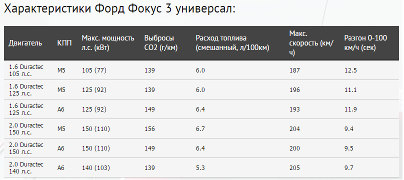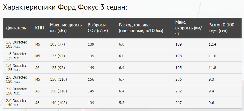 Технические характеристики зависят от самого двигателя. А их великое множество, поэтому перед покупкой нужно обязательно ознакомиться сперва с двигателем автомобиля. Форд Фокус 3 2013 технические характеристики имеет практически такие же, как и остальные модели этого поколения. Они между собой все очень похожи и поддерживают почти одни и те же двигателя. Ниже приведены основные используемые двигатели: