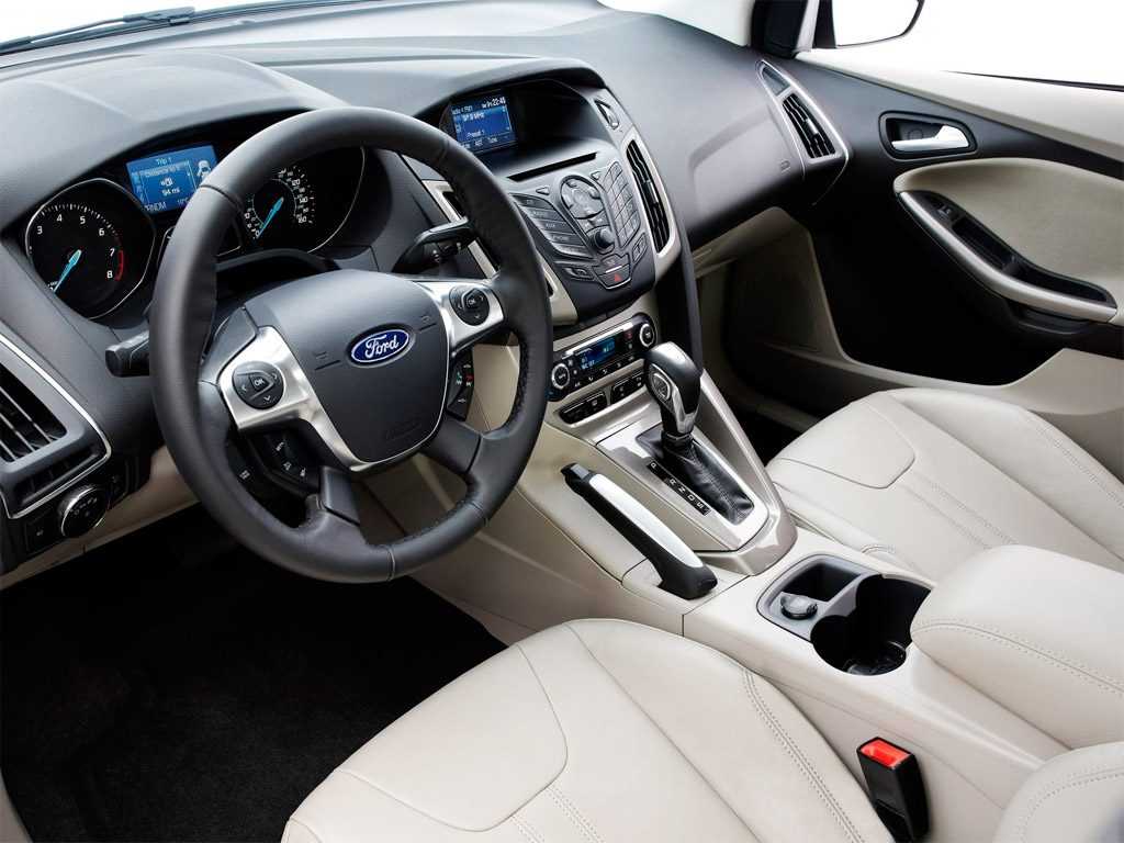 Все стандартные версии машин серии Ford Focus не имеют практически никакого различия в салоне авто. Производители оставили всё тот же кинетический дизайн. Отделка стала изготавливаться из более качественного материала, улучшилась эргономическая характеристика, обхват руля стал намного удобней и регулируется теперь не в одной плоскости, а в двух. Приборная панель имеет подсветку в приятных голубых тонах. На ней размещены спидометр и тахометр, а между этими приборами установлен экран, на который поступают данные от компьютера автомобиля.