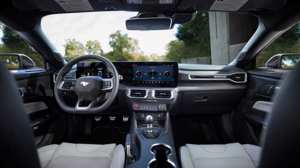 For the physical rather than digital elements of the Mustang, designers have also made a range of upgrades to materials and finishes. There will be a carbonite package with plenty of visible carbon fiber trim. Interior surfaces that previously featured simulated animal grains have shifted to smoother grains, while other surfaces are now being laser etched with patterns like white noise. Speaker bezels are seamlessly integrated into surrounding panels; sometimes, the interior ambient lighting colors can come through the grilles.