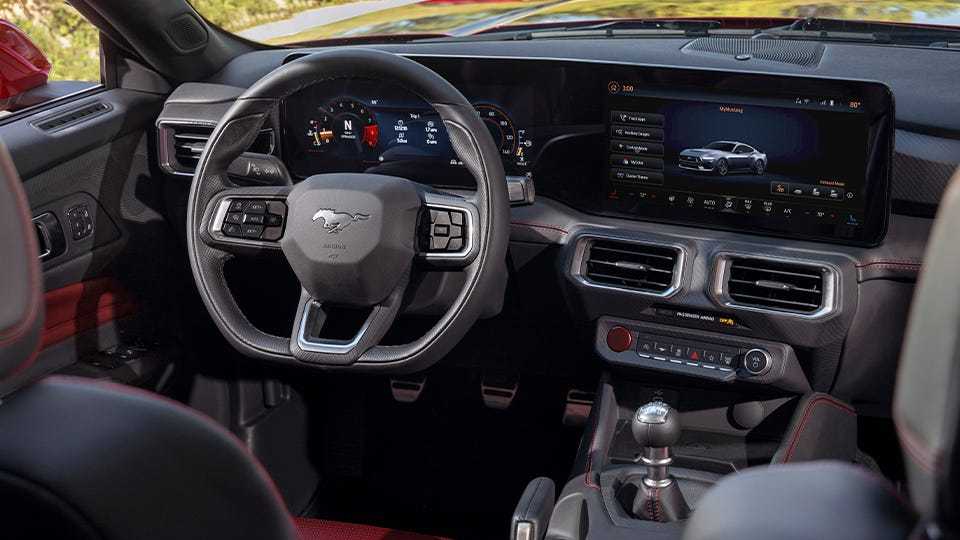 Наконец, есть мультимедийное хранилище с плоской беспроводной зарядной панелью, USB-портами и наклонным слотом для телефона. Модернизированные сиденья обтянуты тканью, синтетической или натуральной кожей, а салон имеет отделку, имитирующую углеродное волокно. Аудиосистема высшего класса — Bang & Olufsen, а Mustang совместим с Apple CarPlay и Android Auto, со встроенным Amazon Alexa для голосовых команд.
