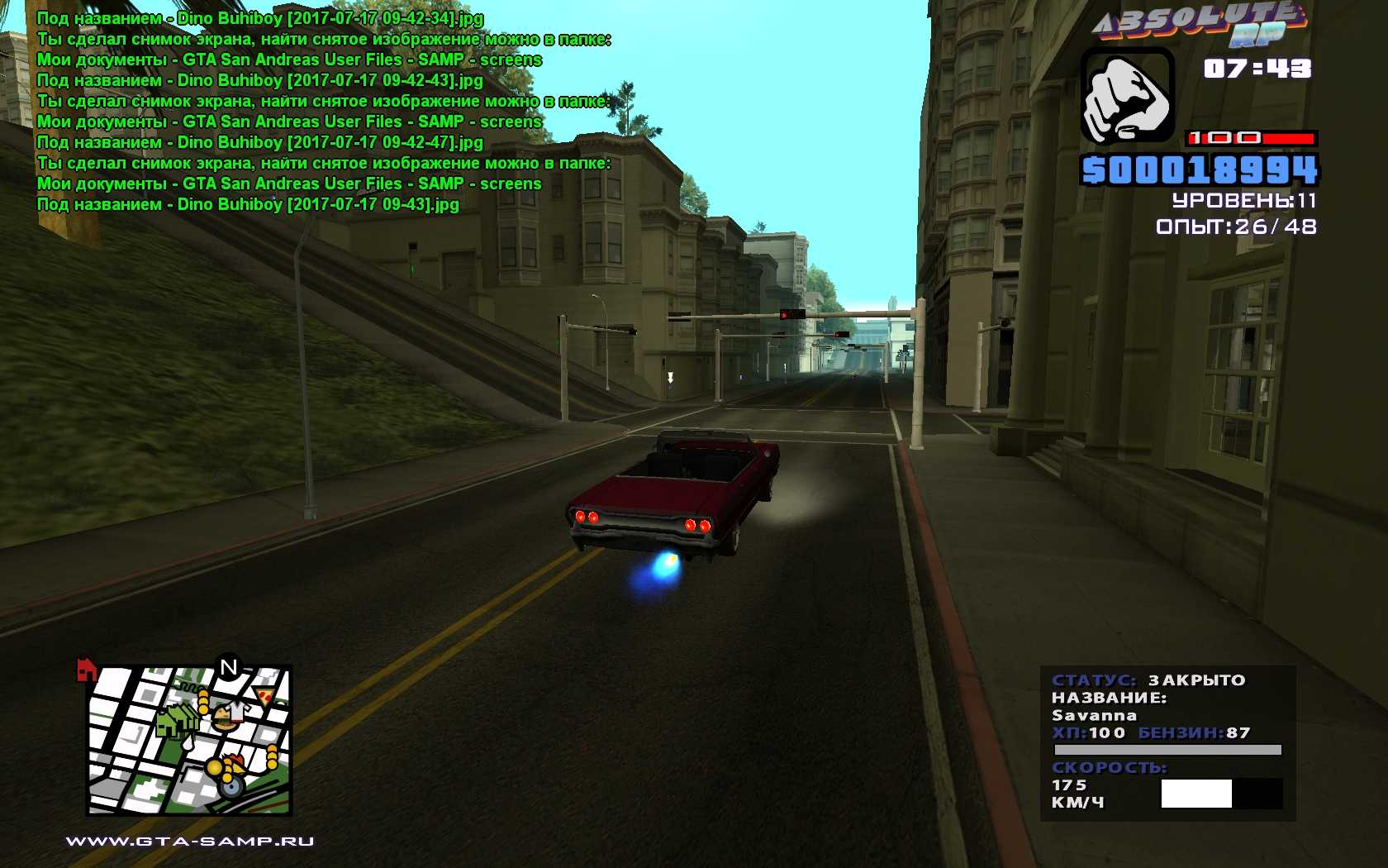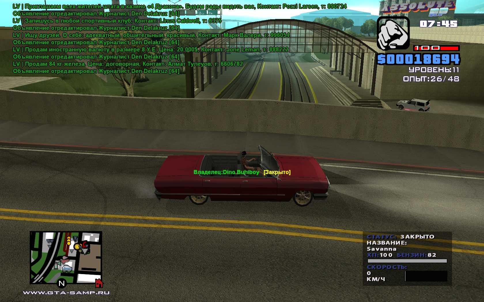 На сервере САМП Абсолют РП купить Саванну можно с 10-ого года проживания в Штате. Новая машина стоит 200 000вирт. На том же Абсолюте встречаются такие лоурайдеры дооборудованные электродвигателем и противоударкой,