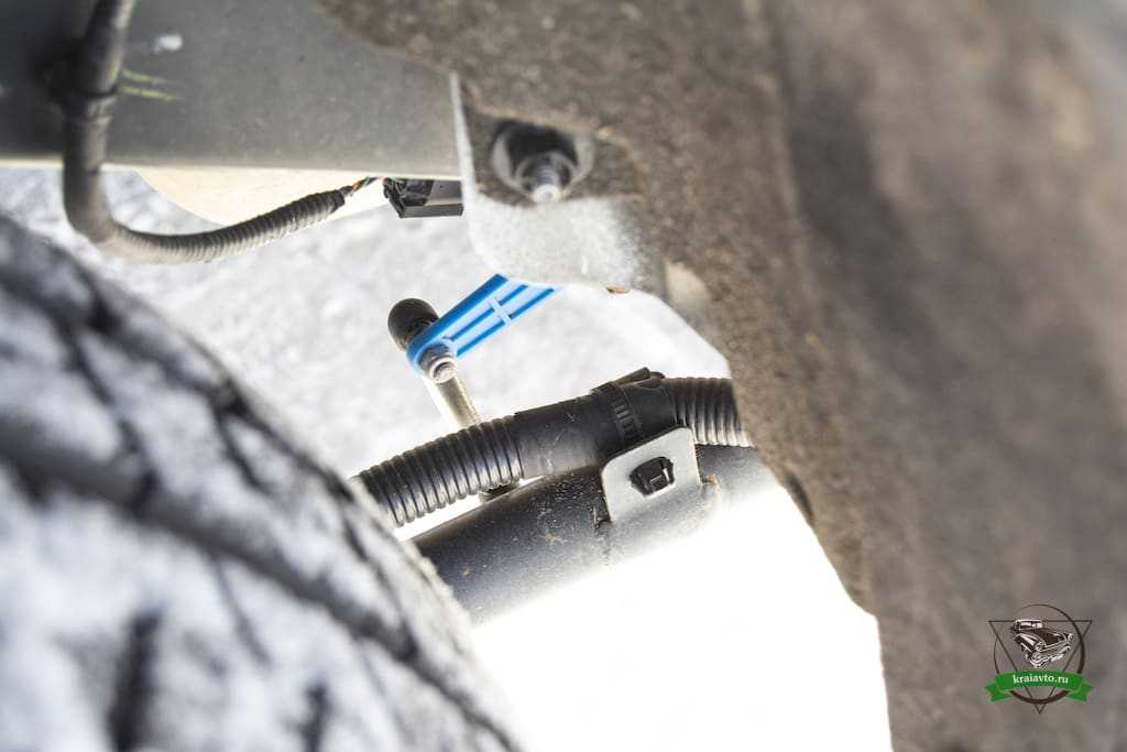 Что заметил конкретно я? При беглом осмотре подкапотного пространства встречаются незащищенные фишки электропроводки, то же самое присутствует на днище автомобиля. А вот этот элемент видно с улицы, ближе к раме. Пластиковый элемент значительно выпирает и выглядит не совсем надежно. Скорее всего это датчик положения кузова, необходимый для работы автокорректора би-ксеноновых фар автомобиля. Выглядит крайне хлипко. Если при повседневной эксплуатации вы вряд ли сможете его повредить, то при движении на лёгком бездорожье есть вероятность, зацепить его какой-нибудь веткой.