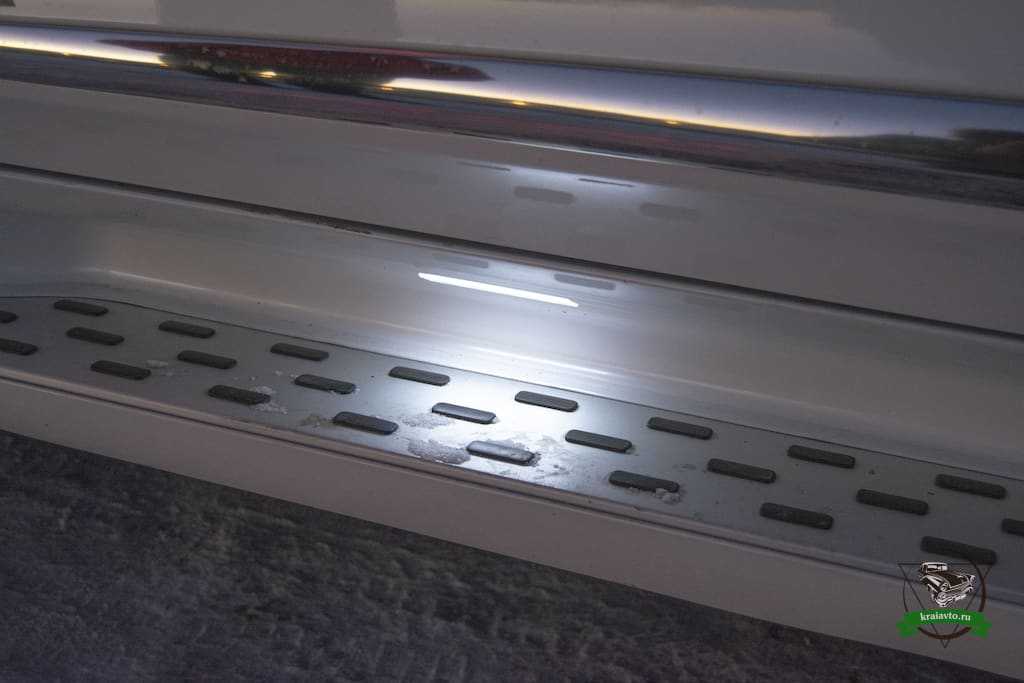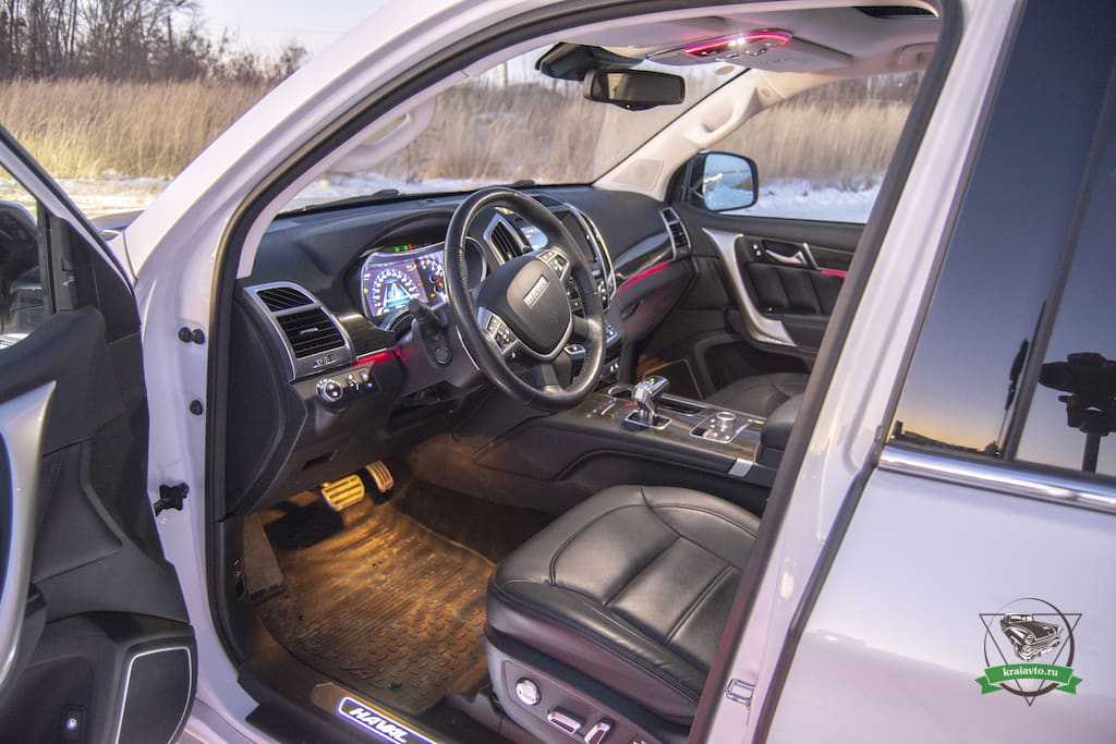 Что хочется отметить отдельно, так это подножки, они здесь очень удобные за счет своей ширины. В темное время суток при открытии машины, на пол проецируется красный логотип HAVAL.