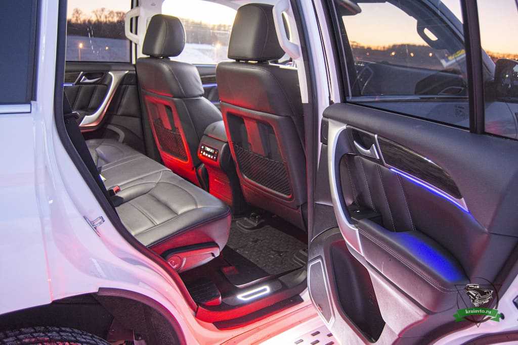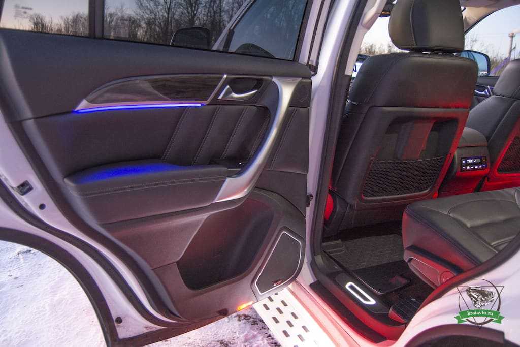 В подножках присутствует яркая белая подсветка, снизу дверей сильная красная подсветка. Пороги подсвечиваются белым, ноги заднего ряда красным. Вот такая какофония цветов встречает задних пассажиров в темное время суток.