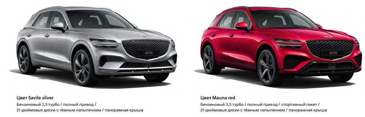 - GV70 — это первый среднеразмерный автомобиль класса SUV в линейке Genesis. Концепция городского внедорожника GV70 — атлетичная элегантность. Авто чувствует себя уверенно, как на скоростной трассе, так и в условиях города, бездорожья. Это первое авто от бренда в России, где реализуется поддержка телематических сервисов. Genesis Connected Services — это новое слово во взаимодействии водителя и авто;
