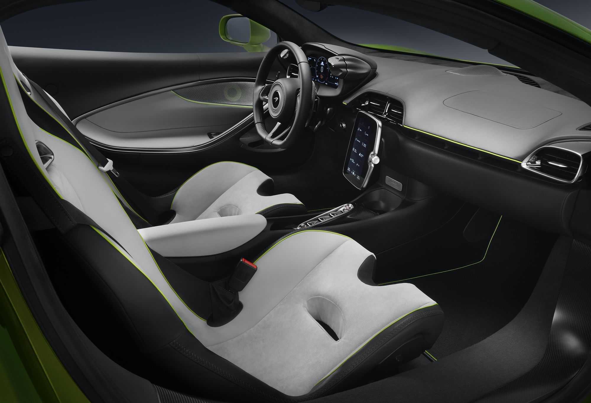 Сам салон — это Ода минимализму. Здесь все подчинено функционалу и предлагается самое необходимое. Это означает, что внутри будут установлены: суперлегкие сиденья с обивкой на выбор, такие элементы как дверные ручки, кнопка запуска двигателя и кнопки открывания окон были расположены на крыше. Трехспицевое рулевое колесо свободно от кнопок и переключателей, в то время как очень простой и узкий горизонтальный экран непосредственно перед водителем сообщает информацию об оборотах двигателя, выбранной передаче и скорости. Все остальные данные и настройки можно увидеть на экране высокой четкости McLaren Folding Driver Display и центральным экране информационно-развлекательной системы.