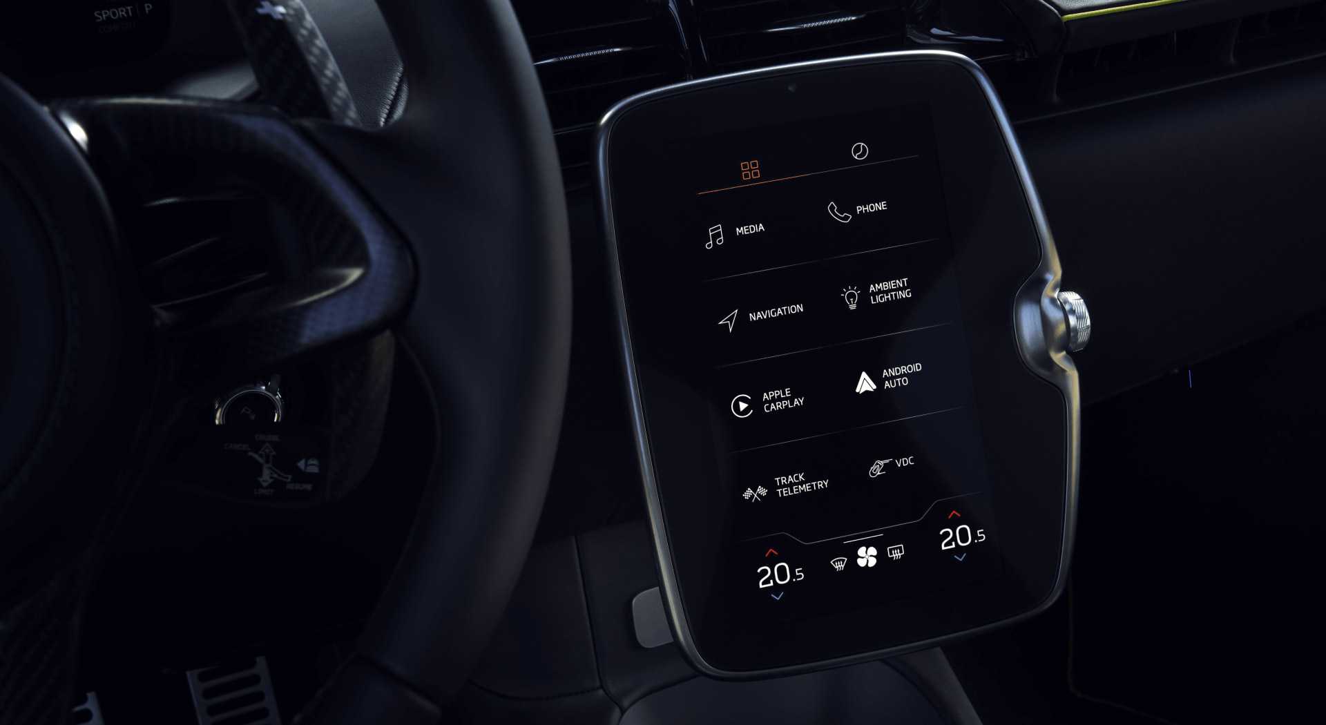 Отделка из углеродного волокна в изобилии, наряду с алькантарой. На маленьком сенсорном экране отсутствует функция Apple CarPlay или Android Auto, он прост в использовании и является хорошим способом скрыть все кнопки, управляющие кондиционером и радио.
