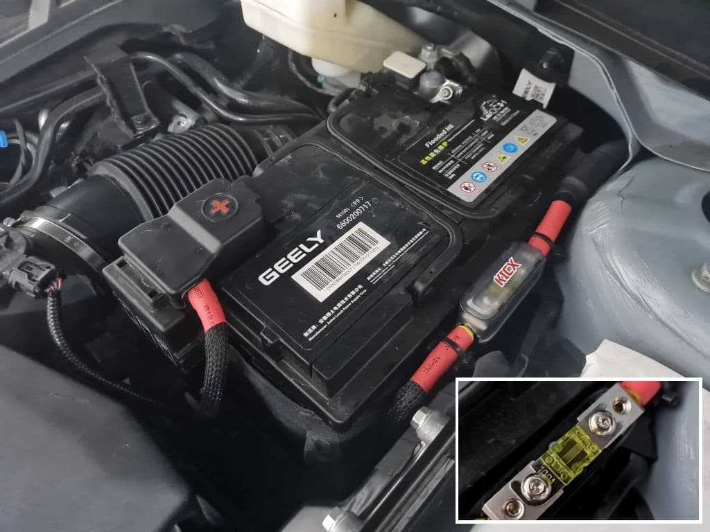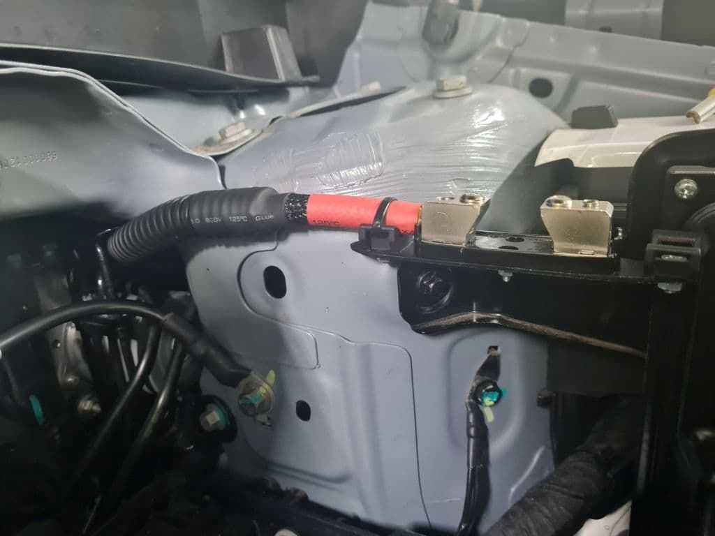 Подключение к плюсовой клемме делается на штатный винт клеммы до заводских предохранителей. Длина нового кабеля от клеммы до предохранителя составляет 30 см, что укладывается с запасом в норму безопасности проводки. Все подкапотные соединения проводов обрабатываются защитным составом для избежания появления коррозии.