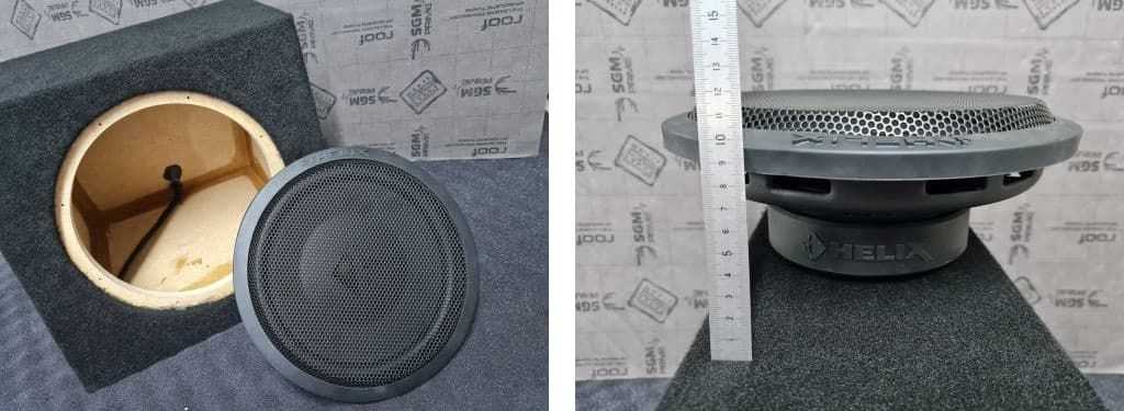 Далее склеиваем корпус и проливаем стыки полиэфирной смолой. Затем перетягиваем готовый корпус в карпет под цвет карпета в багажнике. Сабвуферный динамик Helix K 10S поставляется в комплекте с защитным грилем, и это очень хорошо, ибо у большинства других сабов, гриль нужно покупать отдельно и он не всегда есть в наличии.Отдельным этапом при изготовлении сабвуфера является его настройка, а именно снятие параметров конкретного динамика в конкретном корпусе (для этого у нас есть все необходимое оборудование). В данном случае расчеты получились достаточно точными и нам не пришлось прибегать к регулировке объема короба и наполнения, полученные параметры добротности и резонансной частоты нас вполне устроили.