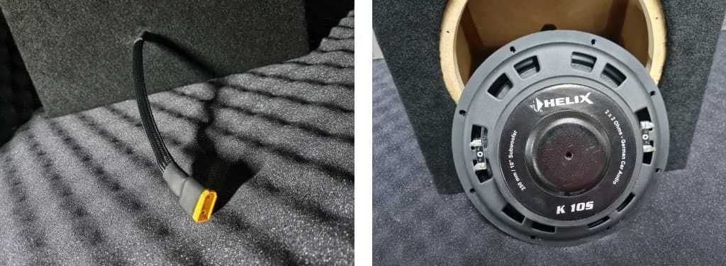 Делаем быстросъемный разъем для простоты снятия\установки сабвуфера в багажник. Мотор динамика — двухкатушечный (2 х 2 Ом), подключаем их последовательно.