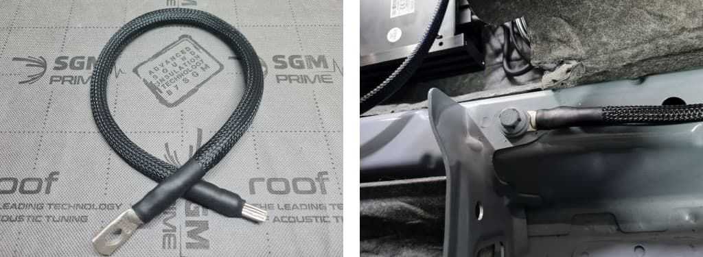 Питание усилителей осуществляется от основного аккумулятора, который находится под капотом. Плюсовой провод проходит через резиновый уплотнитель и заходит в салон, далее идет по кабель-каналу левого борта до усилителей. Масса взята с винта М10 крепящего блок задних сидений, фото будет ниже. Вся силовая проводка сделана из кабеля марки Stinger сечением 25 мм (4 AWG). Все кабели дополнительно защищены «змейкой» по всей длине, так же они закреплены каждые 10-15 см. В подкапотном пространстве кабель еще и защищен гофрой, вплоть до входа в салон.