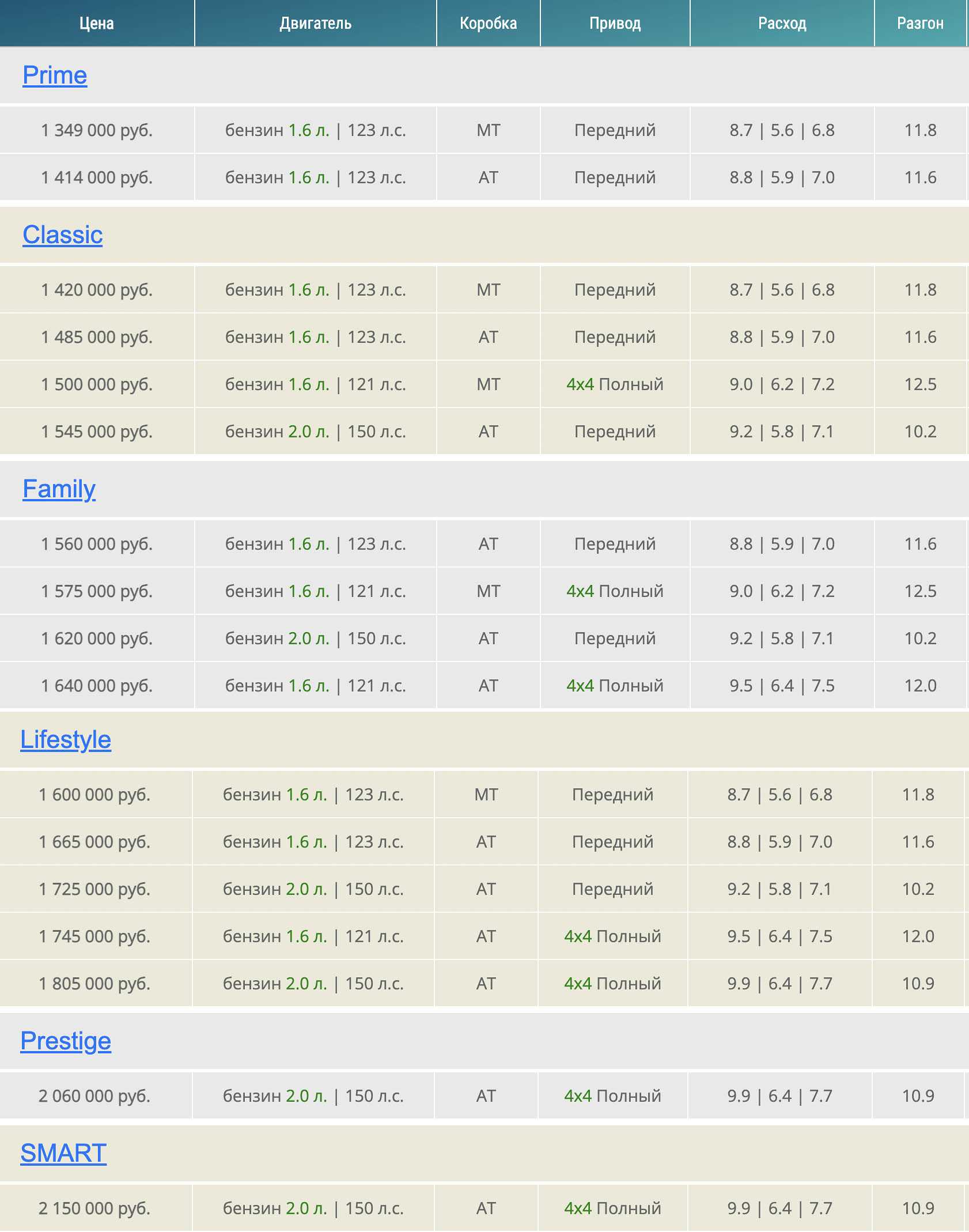 - Premium. Топовая комплектация. Доступна только с передним приводом на автомате и полным приводом на АКПП. Цены составляют от 1,87 и 1,99 миллиона рублей соответственно.