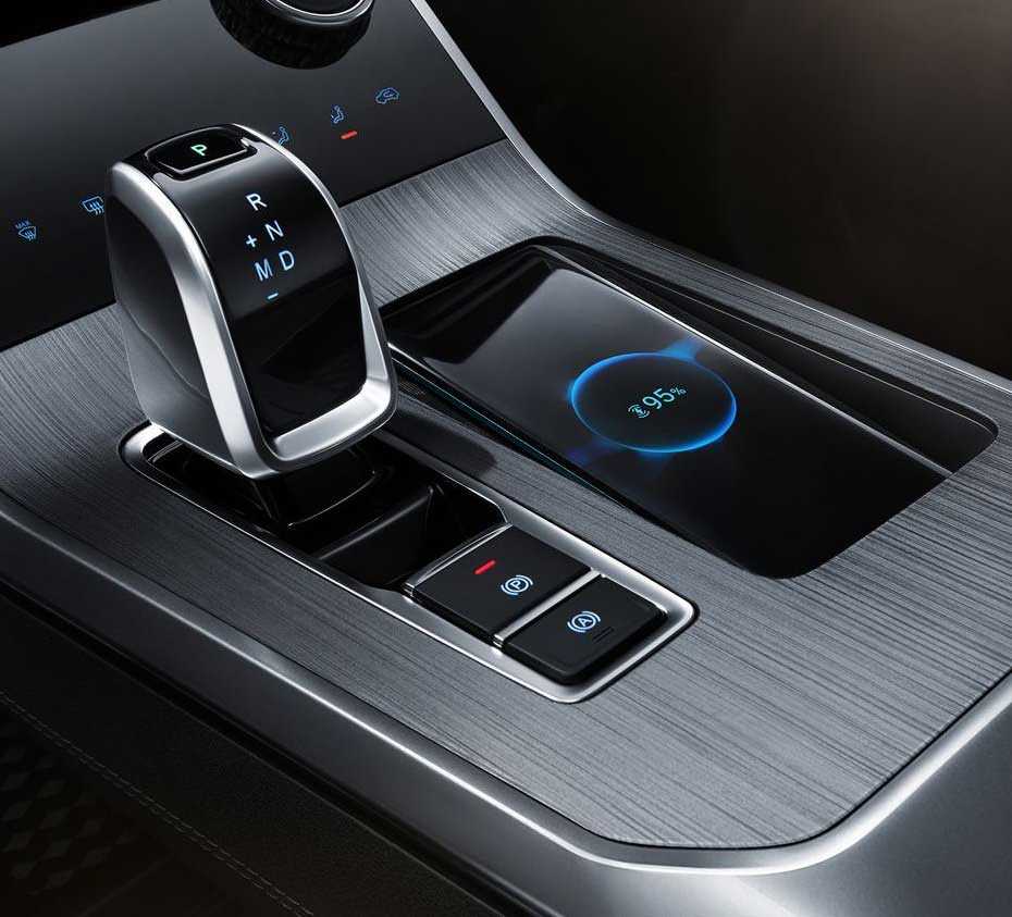 Рычаг КПП бесступенчатой трансмиссии выполнен в виде короткого джойстика, сзади него находятся две клавиши электронного ручника, площадка беспроводной зарядки размещается с правой стороны.