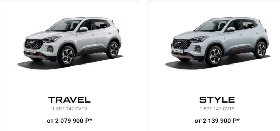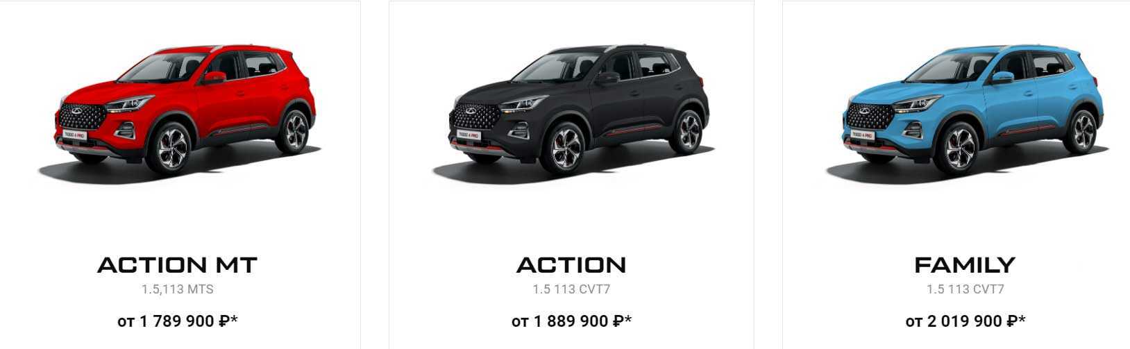 То есть минимальная цена кроссовера Тигго 4 Про в базовой версии с учетом всех бонусов составляет 1.789.900 р., в комплектации Action – 1.889.900 р., Family – 2.019.900 р., Travel – 2.079.900 р., Style – 2.139.900 рублей.