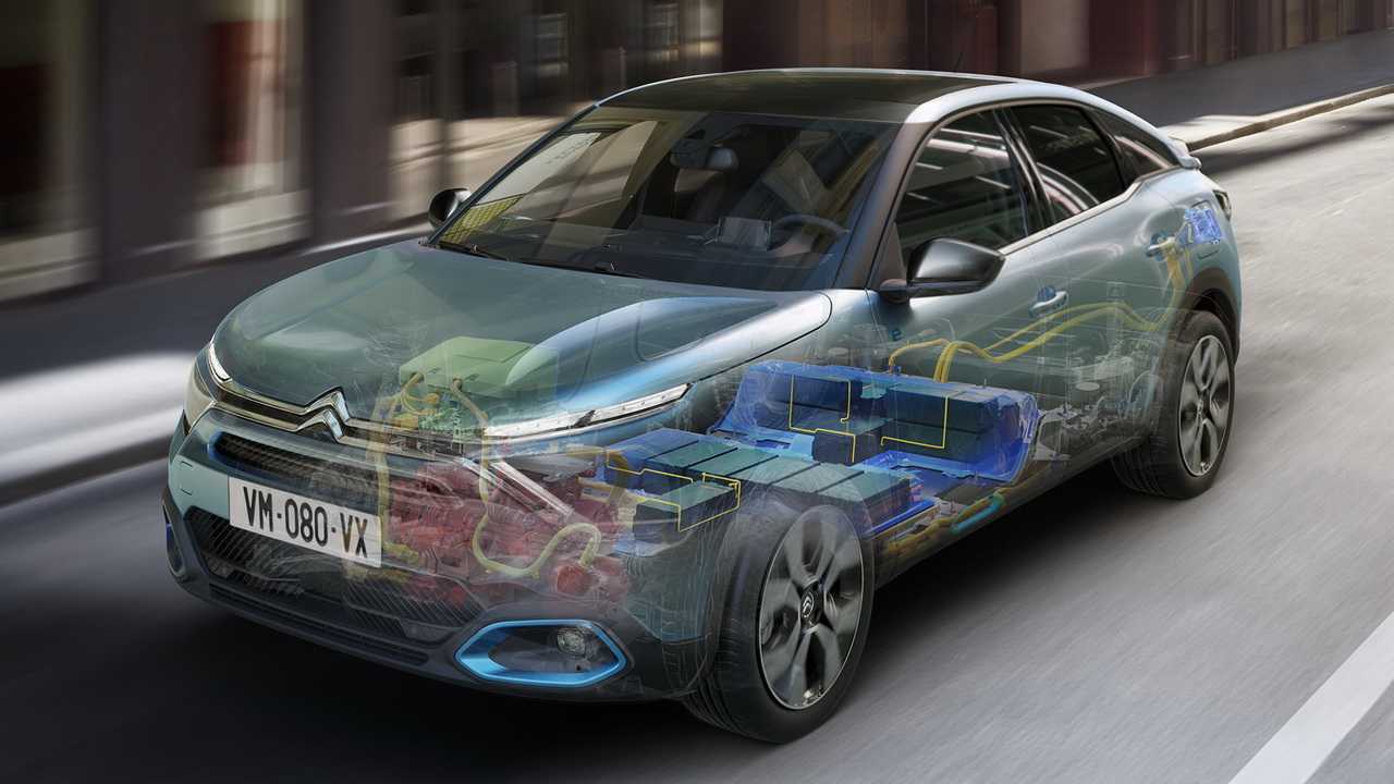 Электрическая модификация Citroen ë-C4 комплектуется мотором с отдачей 136 л.с. и 260 Нм, а также тяговой батареей емкостью 50 кВт*ч (установлена под полом). Зарядка аккумулятора от специального терминала мощностью 100 кВт занимает 30 минут, от настенного устройства – от пяти до семи с половиной часов, от бытовой розетки – минимум 15 часов. Полностью заряженная АКБ обеспечивает пробег около 350 км (цикл WLTP). До 100 км/ч электрический Ситроен С4 разгоняется за 9.7 секунды, тогда как максимальная скорость модели ограничена 150 км/ч.