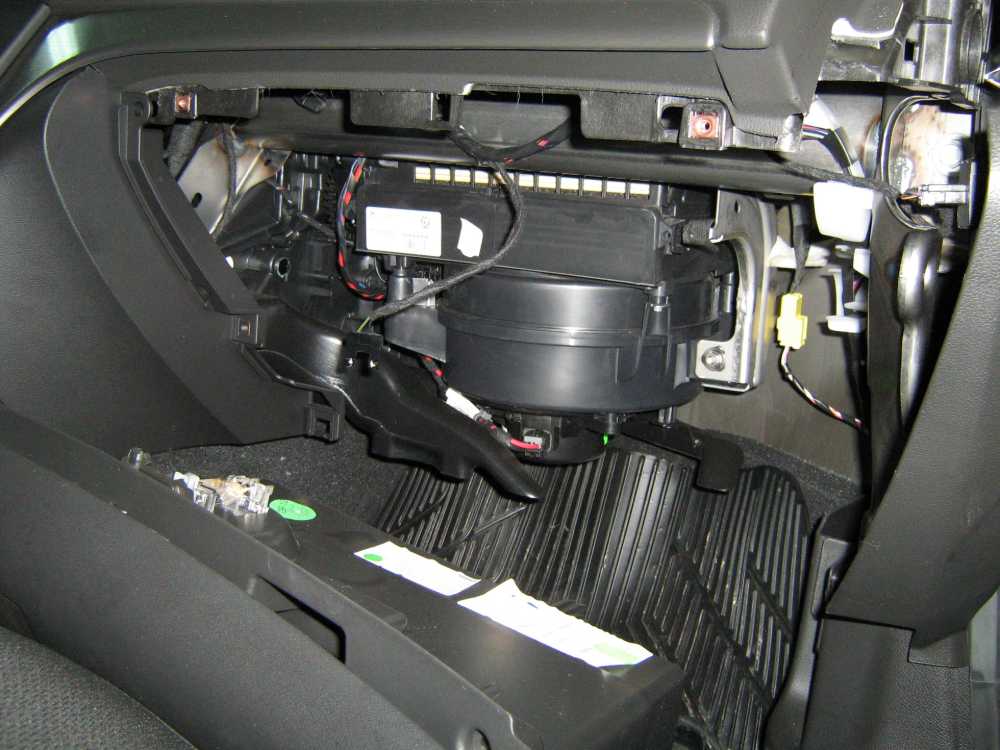 Лучше всего выполнить эту операцию пылесосом, для чего, скорее всего, придётся демонтировать вентилятор, мешающий проникновению насадки пылесоса в отсек. Можно обойтись и без этого, воспользовавшись подходящим приспособлением (например, изогнутой пластиковой лопаткой). Но если уж заниматься профилактикой климатической системы, то желательно также произвести чистку радиатора системы кондиционирования, и в этом случае без демонтажа вентилятора точно не обойтись.