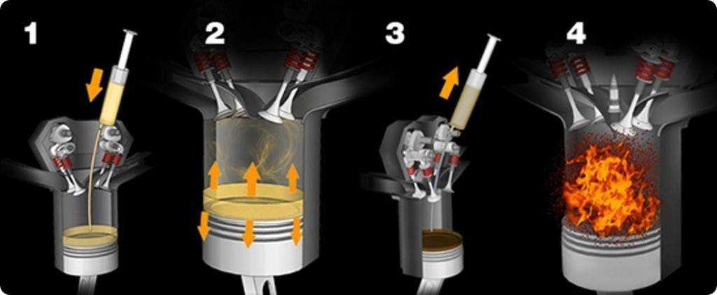 В инжекторных двигателях подача горючей смеси происходит дозированно, что зависит от нагрузки. Топливо впрыскивается в воздушный поток специальными форсунками. Дальше смесь из камеры сгорания попадает в цилиндры мотора.
