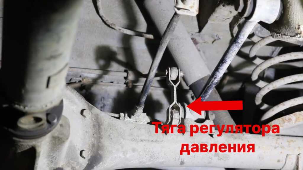 Сначала нужно проверить работоспособность заднего регулятора давления. При нажатии на педаль тормоза, его поршень должен перемещаться, закручивая торсион, соединенный с балкой заднего моста. Если этого не происходит, регулятор подлежит замене. Даже если регулятор в нормальном состоянии, его рекомендуется отключить. Для этого тяга откручивается от моста, и под нее устанавливается опора из удлинителя с головкой.