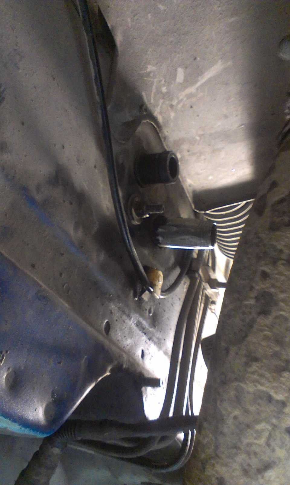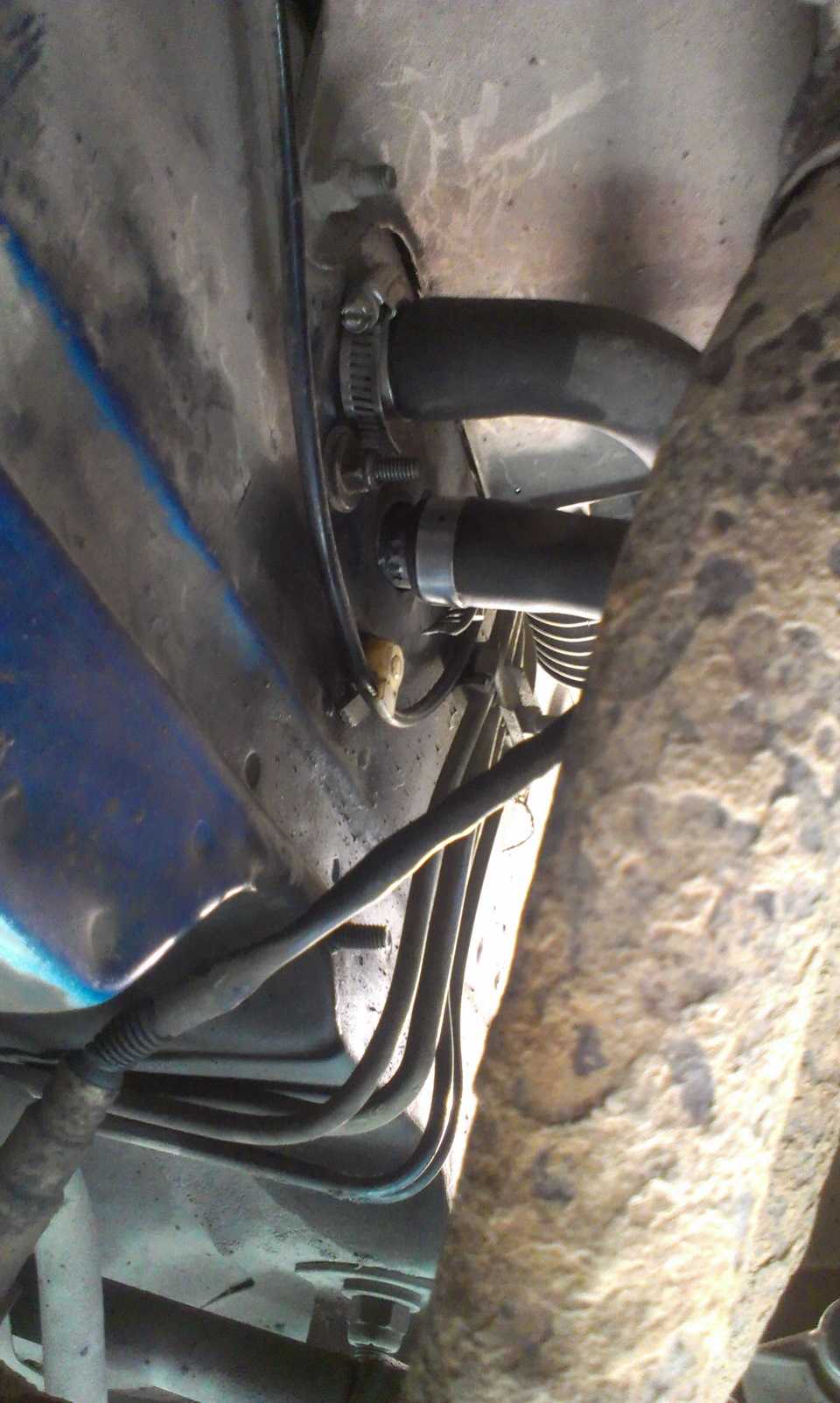 Снизу возле перегородки можно видеть два «внешних шланга». Ослабляем хомуты и снимаем шланги с патрубков. Дальше накидным ключом отворачиваем две гайки (см. фото).