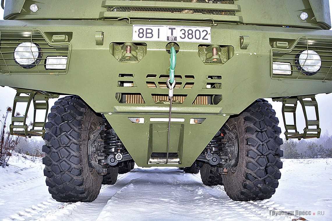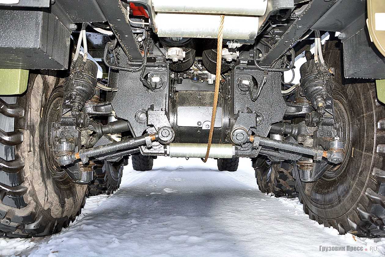 На уровне была и геометрическая проходимость: клиренс 370 мм, глубина преодолеваемого брода 1500 мм (с подготовкой 1800 мм) возможность преодолевать вертикальное препятствие до 450 мм. Крутящий момент через двухскоростную раздаточную коробку передавался на центральные редукторы с межосевыми дифференциалами и далее на планетарные колёсные редукторы.