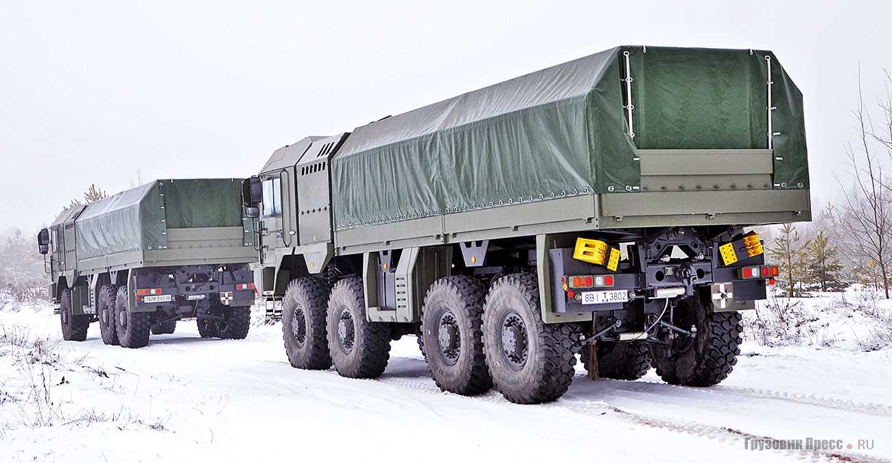 Техника характеризуется наличием проходных мостВнушительный размер шин позволяет сравнивать колёса грузовика с привычными видами гусеничного транспорта.