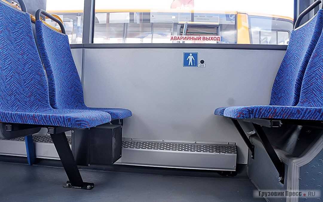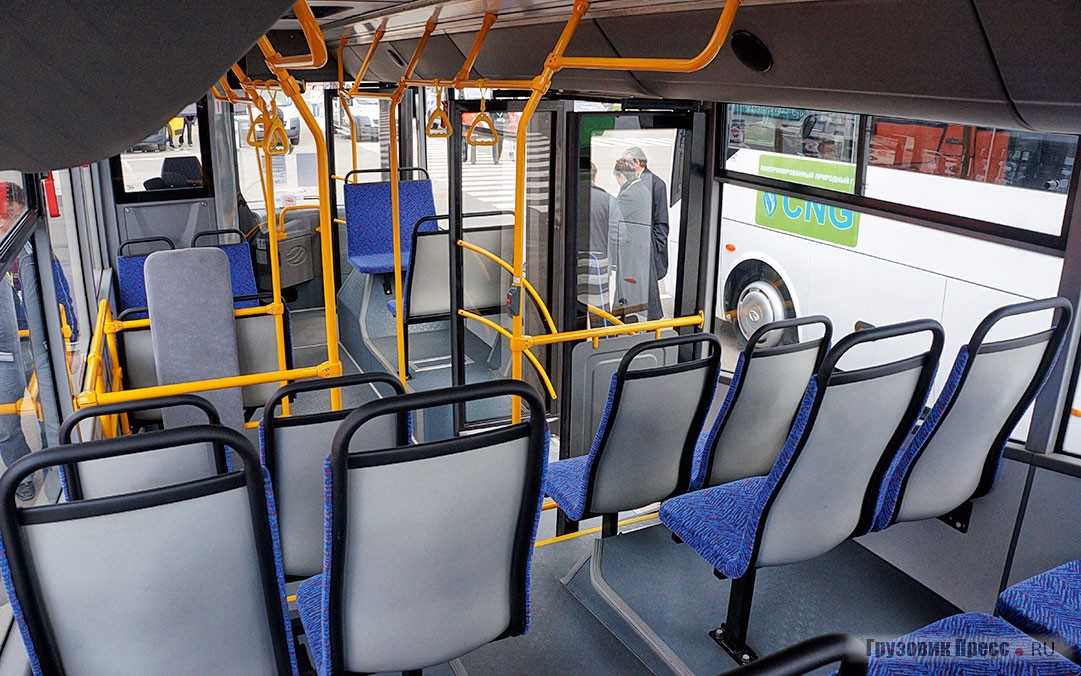 Разумеется, в наличии откидной пандус для заезда колясок, накопительная площадка, кнопки требования остановки. Мне же больше понравилась развитая система поручней и «линейное» освещение салона.